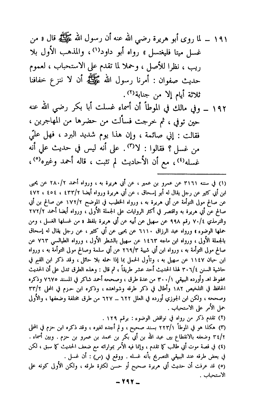» 192 - وفي مالك في الموطأ أن أسماء غسلت أبا بكر - رَضِيَ اللَّهُ عَنْهُ - حين توفي، ثم خرجت فسألت من حضرها من المهاجرين، فقالت: إني صائمة، وإن هذا يوم شديد البرد، فهل علي من غسل؟ فقالوا: لا. على أنه ليس في حديث علي أنه غسله، مع أن الأحاديث لم تثبت، قاله أحمد وغيره،