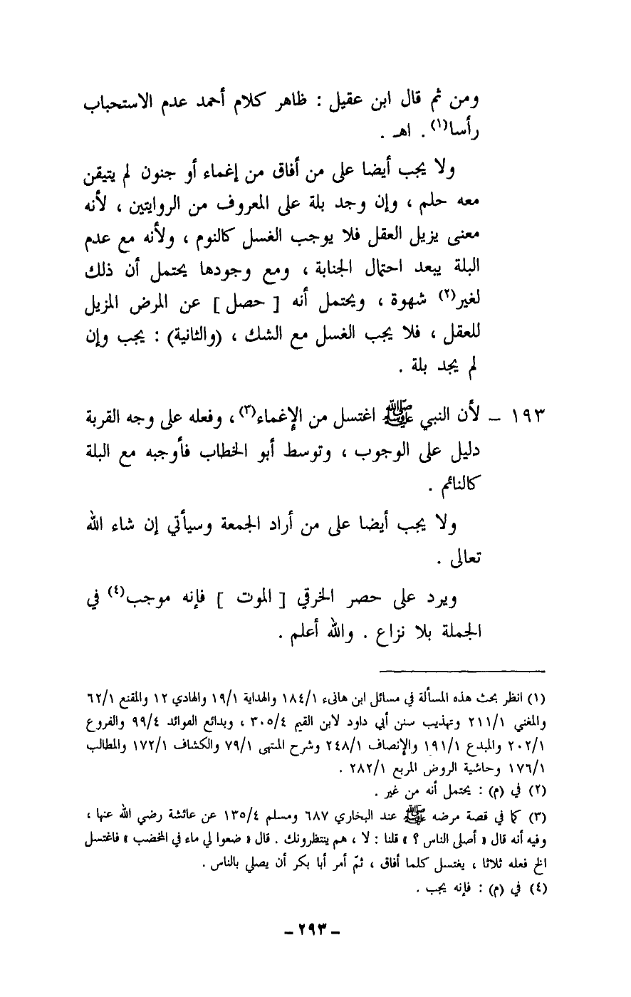 193 - لأن النبي - صَلَّى اللَّهُ عَلَيْهِ وَسَلَّمَ - اغتسل من الإغماء، وفعله على وجه القربة دليل على الوجوب، وتوسط أبو الخطاب فأوجبه مع البلة كالنائم.