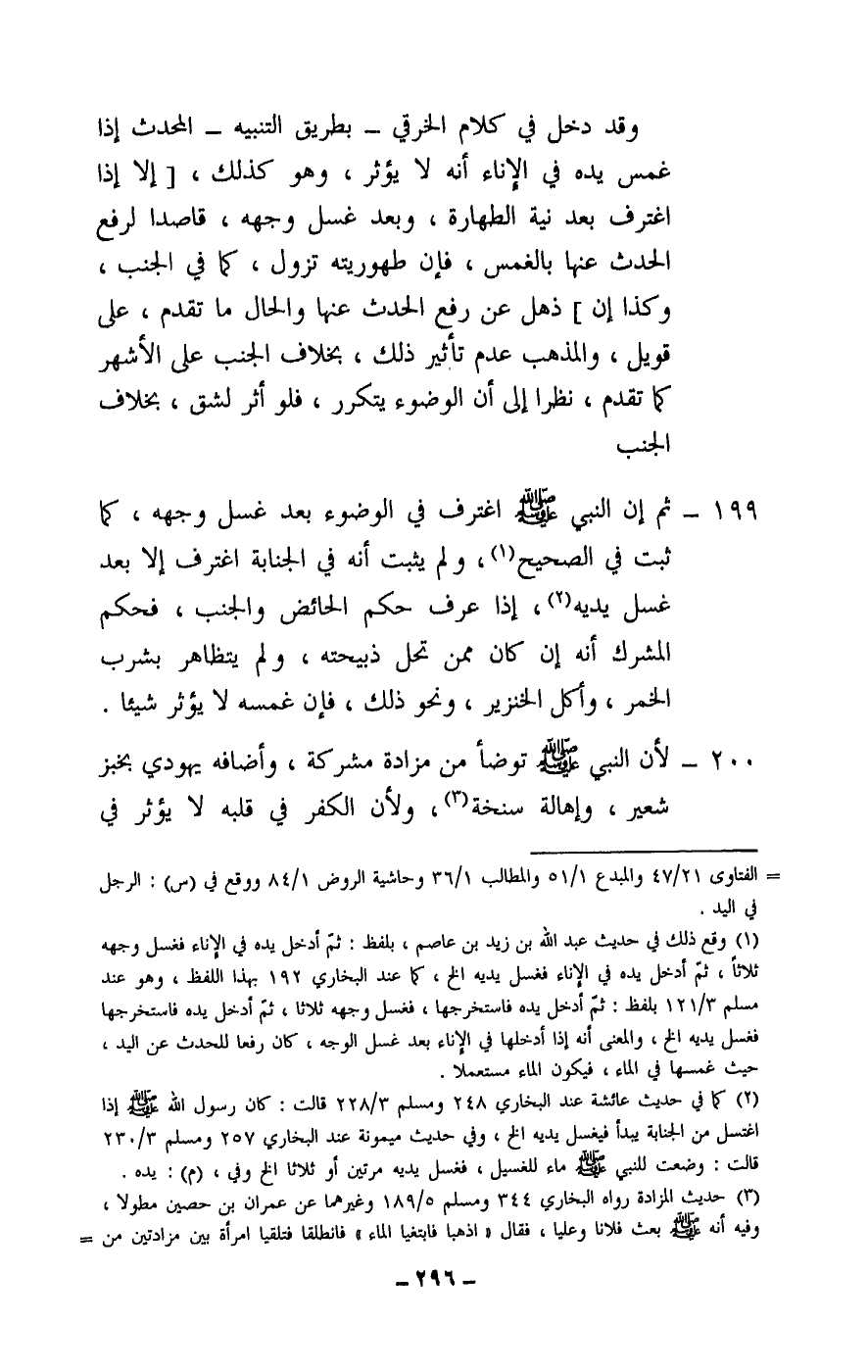 199 - ثم إن النبي - صَلَّى اللَّهُ عَلَيْهِ وَسَلَّمَ - اغترف في الوضوء بعد غسل وجهه، كما ثبت في الصحيح، ولم يثبت أنه في الجنابة اغترف إلا بعد غسل يديه، إذا عرف حكم الحائض والجنب، فحكم المشرك أنه إن كان ممن تحل ذبيحته، ولم يتظاهر بشرب الخمر، وأكل الخنزير، ونحو ذلك، فإن غمسه لا يؤثر شيئا.