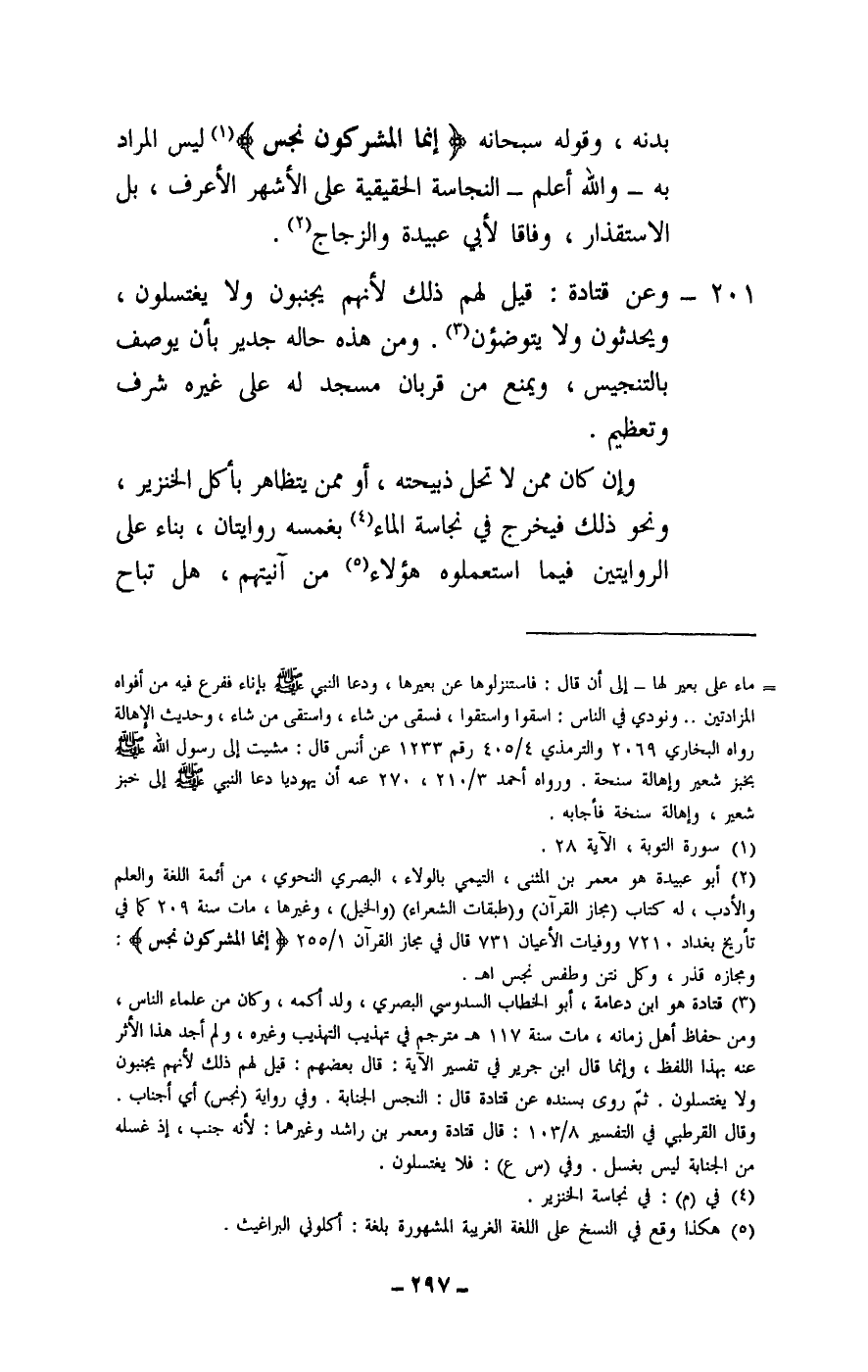 201 - وعن قتادة: قيل لهم ذلك لأنهم يجنبون ولا يغتسلون، ويحدثون ولا يتوضئون. ومن هذه حاله جدير بأن يوصف بالتنجيس، ويمنع من قربان مسجد له على غيره شرف وتعظيم.