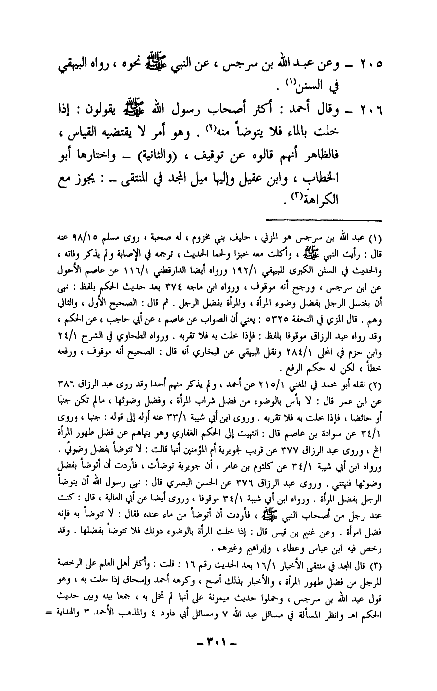 206 - وقال أحمد: أكثر أصحاب رسول الله - صَلَّى اللَّهُ عَلَيْهِ وَسَلَّمَ - يقولون: إذا خلت بالماء فلا يتوضأ منه. وهو أمر لا يقتضيه القياس، فالظاهر أنهم قالوه عن توقيف، (والثانية) - واختارها أبو الخطاب، وابن عقيل وإليها ميل المجد في المنتقى -: يجوز مع الكراهة.