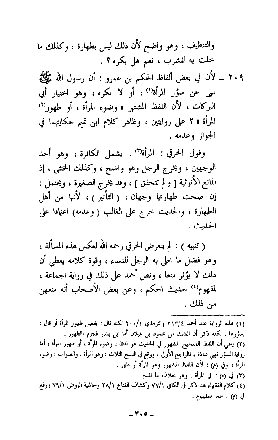 209 - لأن في بعض ألفاظ الحكم بن عمرو: «أن رسول الله - صَلَّى اللَّهُ عَلَيْهِ وَسَلَّمَ - نهى عن سؤر المرأة» ، أو لا يكره، وهو اختيار أبي البركات، لأن اللفظ المشتهر «وضوء المرأة، أو طهور المرأة» ؟ على روايتين، وظاهر كلام ابن تميم حكايتهما في الجواز وعدمه.