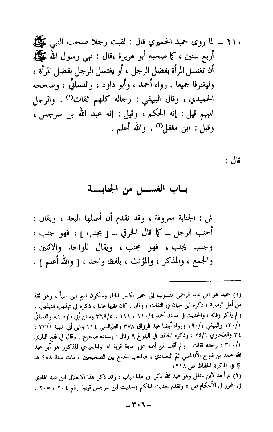 210 - لما روى حميد الحميري قال: لقيت رجلا صحب النبي - صَلَّى اللَّهُ عَلَيْهِ وَسَلَّمَ - أربع سنين، كما صحبه أبو هريرة، قال: «نهى رسول الله - صَلَّى اللَّهُ عَلَيْهِ وَسَلَّمَ - أن تغتسل المرأة بفضل الرجل، أو يغتسل الرجل بفضل المرأة، وليغترفا جميعا» . رواه أحمد، وأبو داود، والنسائي، وصححه الحميدي، وقال البيهقي: رجاله كلهم ثقات. والرجل المبهم قيل: إنه الحكم، وقيل: إنه عبد الله بن سرجس، وقيل: ابن مغفل. والله أعلم.