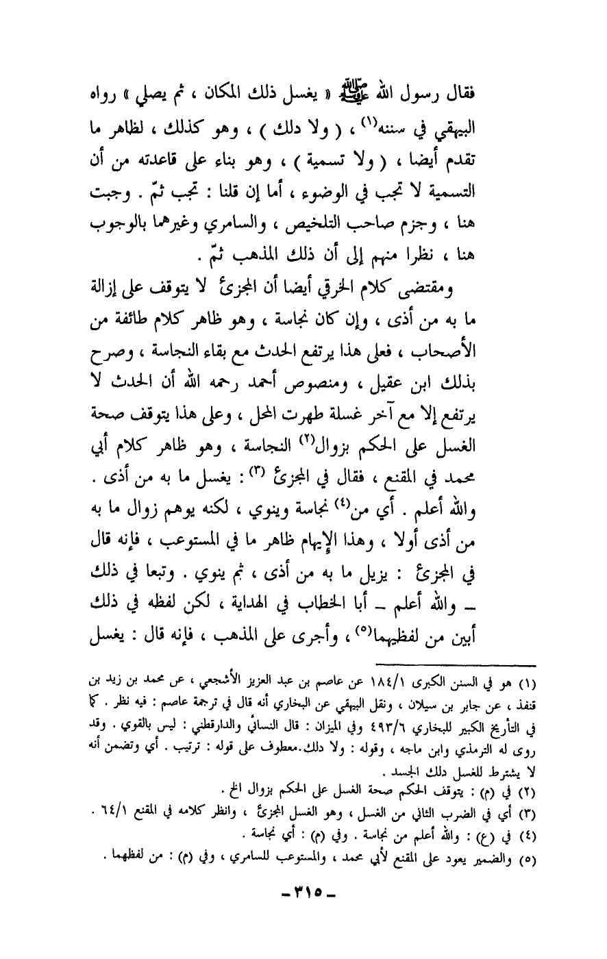 فقال رسول الله - صَلَّى اللَّهُ عَلَيْهِ وَسَلَّمَ -: «يغسل ذلك المكان، ثم يصلي» رواه البيهقي في سننه، (ولا دلك) ، وهو كذلك، لظاهر ما تقدم أيضا، (ولا تسمية) ، وهو بناء على قاعدته من أن التسمية لا تجب في الوضوء، أما إن قلنا: تجب ثم. وجبت هنا، وجزم صاحب التلخيص، والسامري وغيرهما بالوجوب هنا، نظرا منهم إلى أن ذلك المذهب ثم.