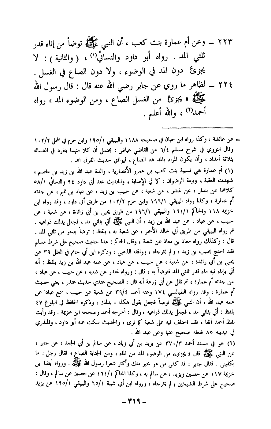 223 - وعن أم عمارة بنت كعب، «أن النبي - صَلَّى اللَّهُ عَلَيْهِ وَسَلَّمَ - توضأ من إناء قدر ثلثي المد.» رواه أبو داود والنسائي، (والثانية) : لا يجزئ دون المد في الوضوء، ولا دون الصاع في الغسل.