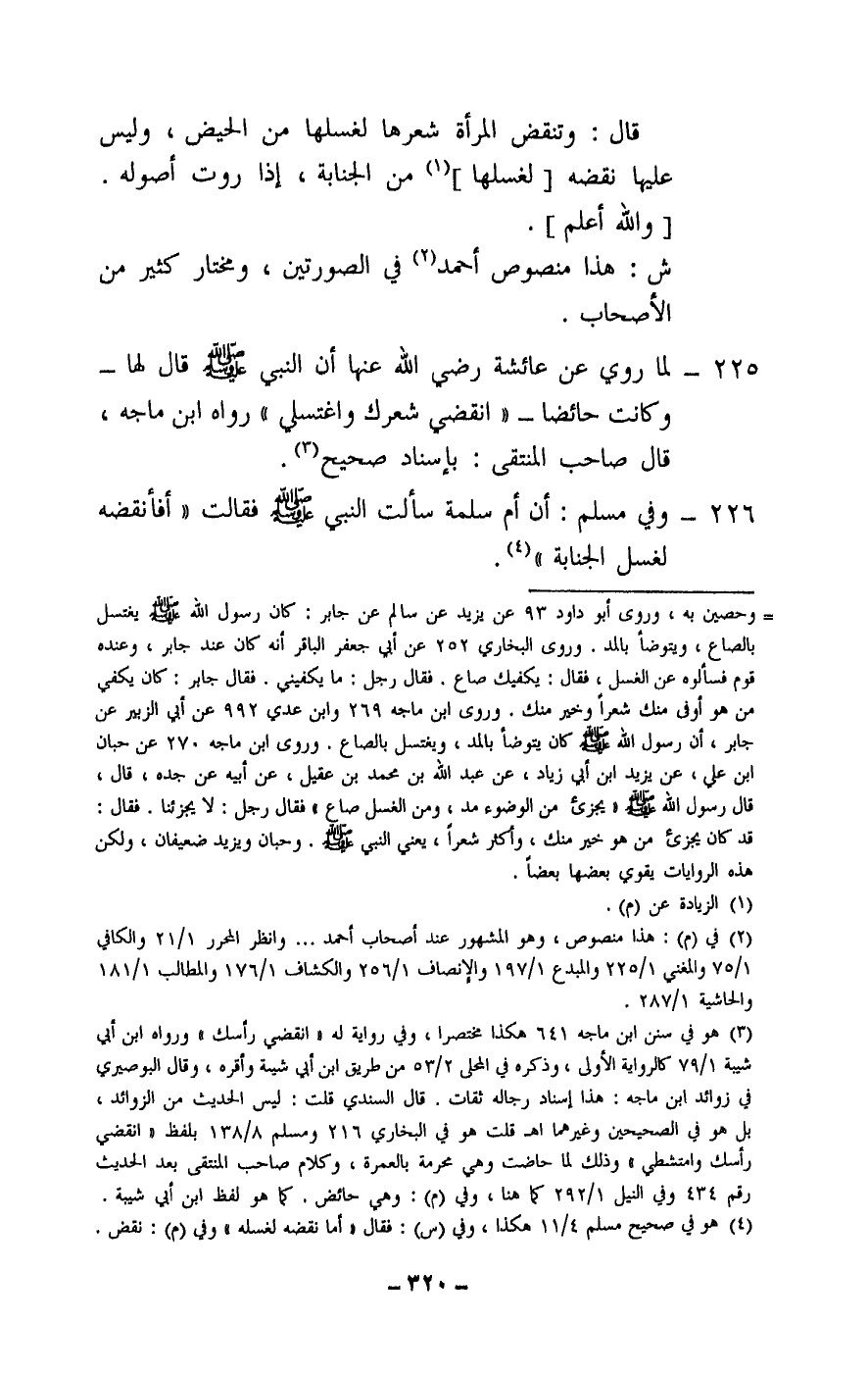 225 - لما روي عن «عائشة - رَضِيَ اللَّهُ عَنْهَا - أن النبي - صَلَّى اللَّهُ عَلَيْهِ وَسَلَّمَ - قال لها - وكانت حائضا - «انقضي شعرك واغتسلي» رواه ابن ماجه، قال صاحب المنتقى: بإسناد صحيح.