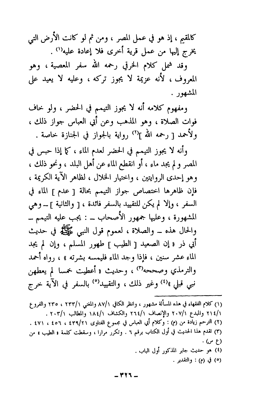 وأنه لا يجوز التيمم في الحضر لعدم الماء، كما إذا حبس في المصر ولم يجد ماء، أو انقطع الماء عن أهل البلد، ونحو ذلك، وهو إحدى الروايتين، واختيار الخلال، لظاهر الآية الكريمة فإن ظاهرها اختصاص جواز التيمم بحالة [عدم] الماء في السفر، وإلا لم يكن للتقييد بالسفر فائدة، [والثانية] : - وهي المشهورة، وعليها جمهور الأصحاب -: يجب عليه التيمم - والحال هذه - والصلاة، لعموم قول النبي - صَلَّى اللَّهُ عَلَيْهِ وَسَلَّمَ - في حديث أبي ذر «إن الصعيد [الطيب] طهور المسلم، وإن لم يجد الماء عشر سنين، فإذا وجد الماء فليمسه بشرته» ، رواه أحمد والترمذي وصححه، وحديث «أعطيت خمسا لم يعطهن نبي قبل» وغير ذلك، والتقييد بالسفر في الآية خرج