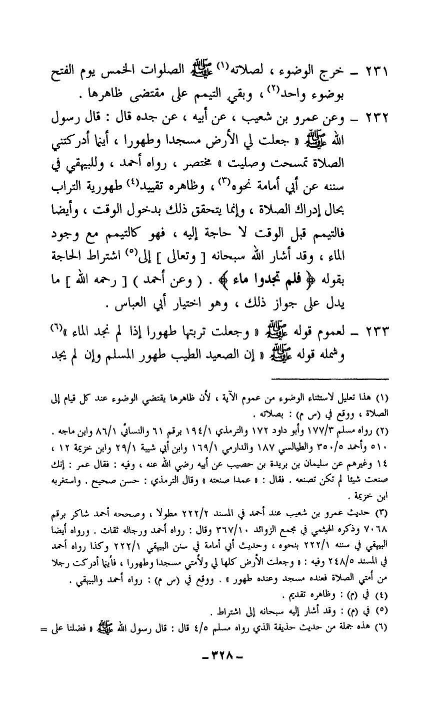 232 - وعن عمرو بن شعيب، عن أبيه، عن جده قال: قال رسول الله - صَلَّى اللَّهُ عَلَيْهِ وَسَلَّمَ -: «جعلت لي الأرض مسجدا وطهورا، أينما أدركتني الصلاة تمسحت وصليت» مختصر، رواه أحمد، وللبيهقي في سننه عن أبي أمامة نحوه، وظاهره تقييد طهورية التراب بحال إدراك الصلاة، وإنما يتحقق ذلك بدخول الوقت، وأيضا فالتيمم قبل الوقت لا حاجة إليه، فهو كالتيمم مع وجود الماء، وقد أشار الله سبحانه [وتعالى] إلى اشتراط الحاجة بقوله: {فَلَمْ تَجِدُوا مَاءً} [النساء: 43] . (وعن أحمد) [- رَحِمَهُ اللَّهُ -] ما يدل على جواز ذلك، وهو اختيار أبي العباس.