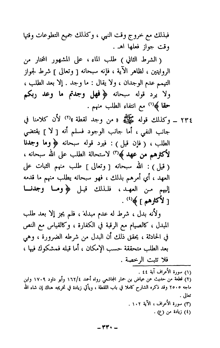 234 - وكذلك قوله - صَلَّى اللَّهُ عَلَيْهِ وَسَلَّمَ -: «من وجد لقطة» لأن كلامنا في جانب النفي، أما جانب الوجود فسلم أنه [لا] يقتضي الطلب، (فإن قيل) : فيرد قوله سبحانه: {وَمَا وَجَدْنَا لِأَكْثَرِهِمْ مِنْ عَهْدٍ} [الأعراف: 102] لاستحالة الطلب على الله سبحانه، (قيل) : الله سبحانه [وتعالى] طلب منهم الثبات على العهد، أي أمرهم بذلك، فهو سبحانه يطلب منهم ما قدمه إليهم من العهد، فلذلك قيل: {وَمَا وَجَدْنَا لِأَكْثَرِهِمْ} [الأعراف: 102] .