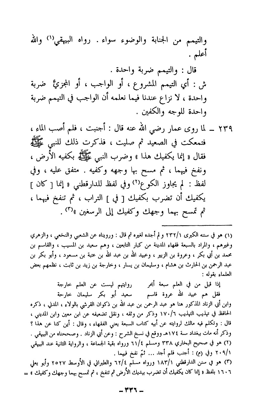 239 - لما «روى عمار - رَضِيَ اللَّهُ عَنْهُ - قال: أجنبت، فلم أصب الماء، فتمعكت في الصعيد ثم صليت، فذكرت ذلك للنبي - صَلَّى اللَّهُ عَلَيْهِ وَسَلَّمَ - فقال: «إنما يكفيك هذا» وضرب النبي - صَلَّى اللَّهُ عَلَيْهِ وَسَلَّمَ - بكفيه الأرض، ونفخ فيهما، ثم مسح بها وجهه وكفيه. متفق عليه، وفي لفظ: لم يجاوز الكوع وفي لفظ للدارقطني «إنما [كان] يكفيك أن تضرب بكفيك [في] التراب، ثم تنفخ فيهما، ثم تمسح بهما وجهك وكفيك إلى الرسغين» .