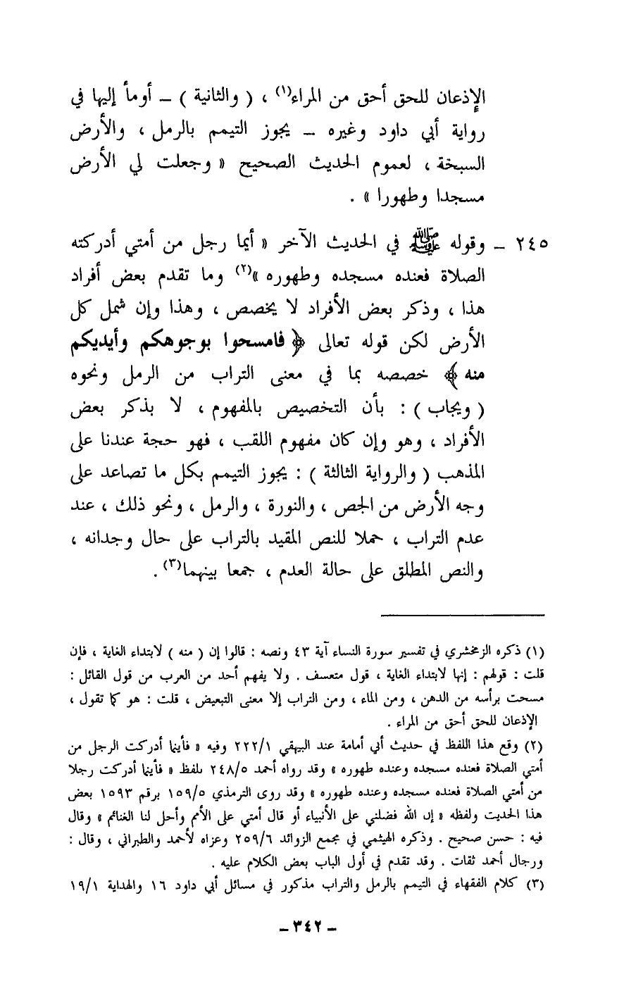 245 - وقوله في الحديث الآخر: «أيما رجل من أمتي أدركته الصلاة فعنده مسجده وطهوره» وما تقدم بعض أفراد هذا، وذكر بعض الأفراد لا يخصص، وهذا وإن شمل كل الأرض لكن قَوْله تَعَالَى: {فَامْسَحُوا بِوُجُوهِكُمْ وَأَيْدِيكُمْ مِنْهُ} [المائدة: 6] خصصه بما في معنى التراب من الرمل ونحوه (ويجاب) : بأن التخصيص بالمفهوم، لا بذكر بعض الأفراد، وهو وإن كان مفهوم اللقب، فهو حجة عندنا على المذهب (والرواية الثالثة) : يجوز التيمم بكل ما تصاعد على وجه الأرض من الجص، والنورة، والرمل، ونحو ذلك، عند عدم التراب، حملا للنص المقيد بالتراب على حال وجدانه، والنص المطلق على حالة العدم، جمعا بينهما.