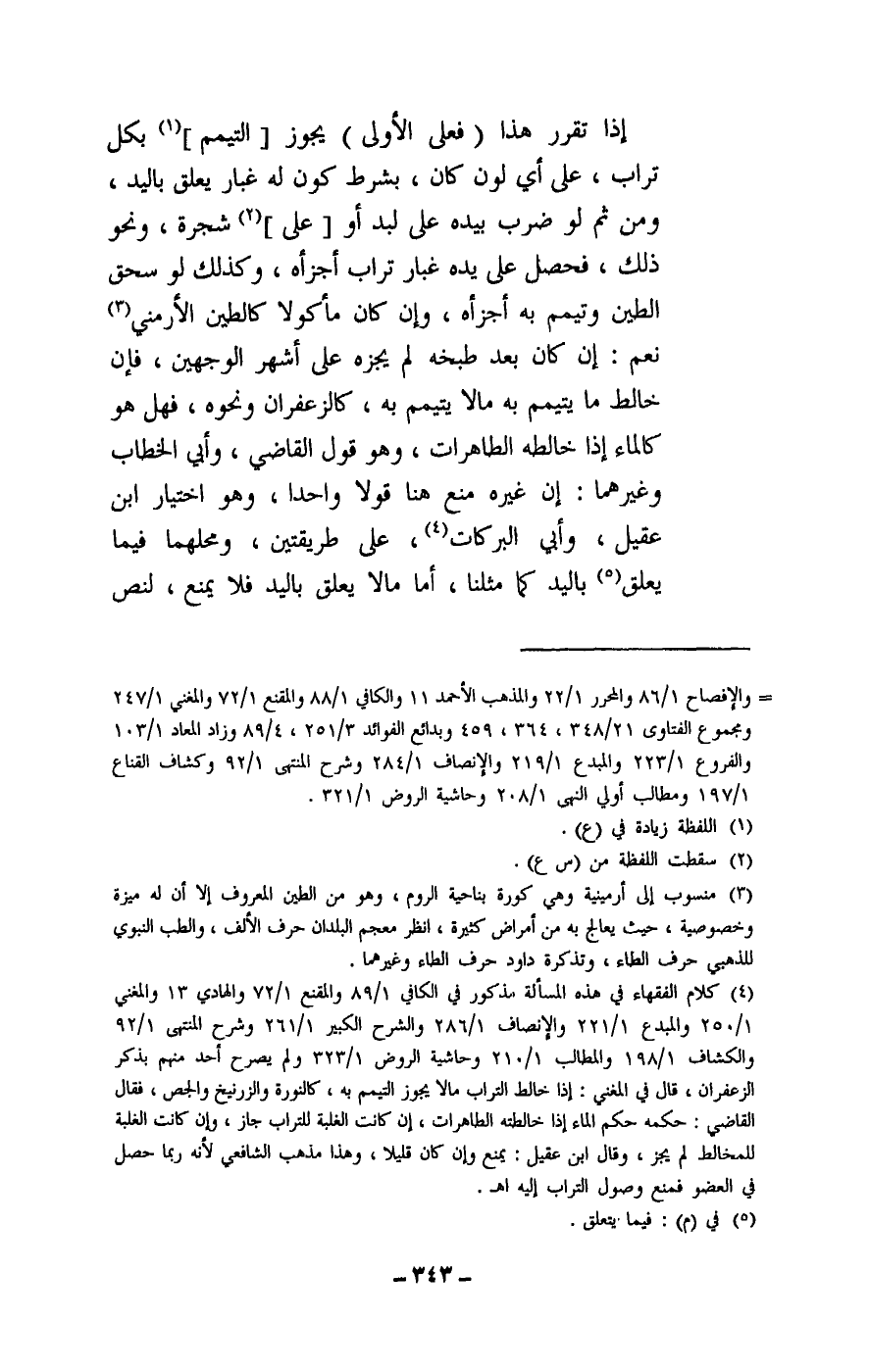 إذا تقرر هذا (فعلى الأولى) يجوز [التيمم] بكل تراب، على أي لون كان، بشرط كونه له غبار يعلق باليد، ومن ثم لو ضرب بيده على لبد أو [على] شجرة، ونحو ذلك، فحصل على يده غبار تراب أجزأه، وكذلك لو سحق الطين وتيمم به أجزأه، وإن كان مأكولا كالطين الأرمني، نعم: إن كان بعد طبخه لم يجزه على أشهر الوجهين، فإن خالط ما يتيمم به ما لا يتيمم به، كالزعفران ونحوه، فهل هو كالماء إذا خالطه الطاهرات، وهو قول القاضي، وأبي الخطاب وغيرهما: إن غيره منع هنا قولا واحدا، وهو اختيار ابن عقيل، وأبي البركات، على طريقتين، ومحلهما فيما يعلق باليد كما مثلنا، أما ما لا يعلق باليد فلا يمنع، لنص