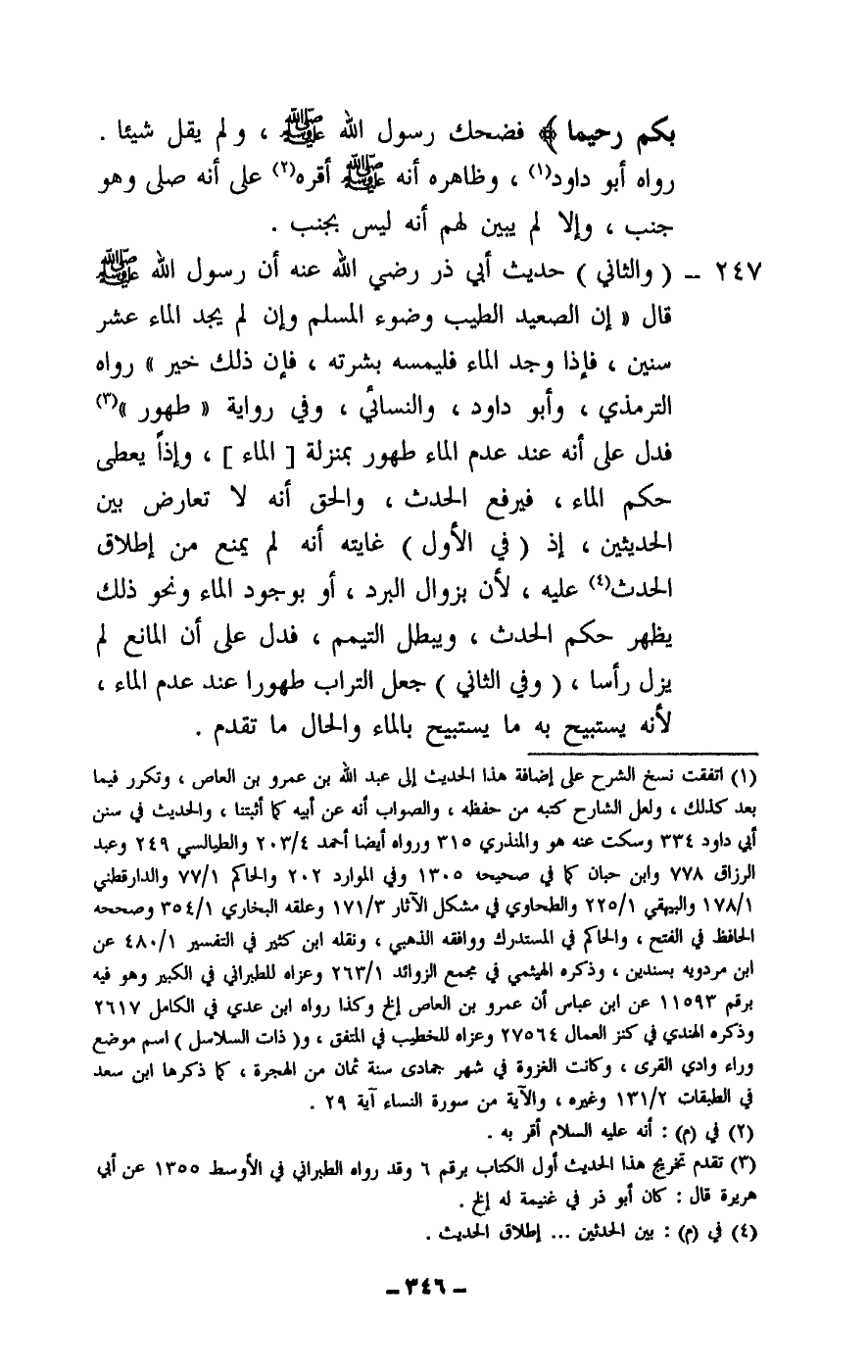 247 - (والثاني) : حديث أبي ذر - رَضِيَ اللَّهُ عَنْهُ - أن رسول الله - صَلَّى اللَّهُ عَلَيْهِ وَسَلَّمَ - قال: «إن الصعيد الطيب وضوء المسلم وإن لم يجد الماء عشر سنين، فإذا وجد الماء فليمسه بشرته، فإن ذلك خير» رواه الترمذي، وأبو داود، والنسائي، وفي رواية «طهور» فدل على أنه عند عدم الماء طهور بمنزلة [الماء] ، وإذا يعطى حكم الماء، فيرفع الحدث، والحق أنه لا تعارض بين الحديثين، إذ (في الأول) غايته أنه لم يمنع من إطلاق الحدث عليه، لأن بزوال البرد، أو بوجود الماء ونحو ذلك يظهر حكم الحدث، ويبطل التيمم، فدل على أن المانع لم يزل رأسا، (وفي الثاني) جعل التراب طهورا عند عدم الماء، لأنه يستبيح به ما يستبيح بالماء والحال ما تقدم.