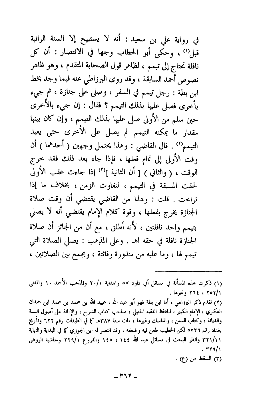 في رواية علي بن سعيد: أنه لا يستبيح إلا السنة الراتبة قبل، وحكى أبو الخطاب وجها في الانتصار: أن كل نافلة تحتاج إلى تيمم، لظاهر قول الصحابة المتقدم، وهو ظاهر نصوص أحمد السابقة، وقد روى البرزاطي عنه فيما وجد بخط ابن بطة: رجل تيمم في السفر، وصلى على جنازة، ثم جيء بأخرى فصلى عليها بذلك التيمم، فقال: إن جيء بالأخرى حين سلم من الأولى صلى عليها بذلك التيمم، وإن كان بينها مقدار ما يمكنه التيمم لم يصل على الأخرى حتى يعيد التيمم. قال القاضي: وهذا يحتمل وجهين (أحدهما) أن وقت الأولى إلى تمام فعلها، فإذا جاء بعد ذلك فقد خرج الوقت.