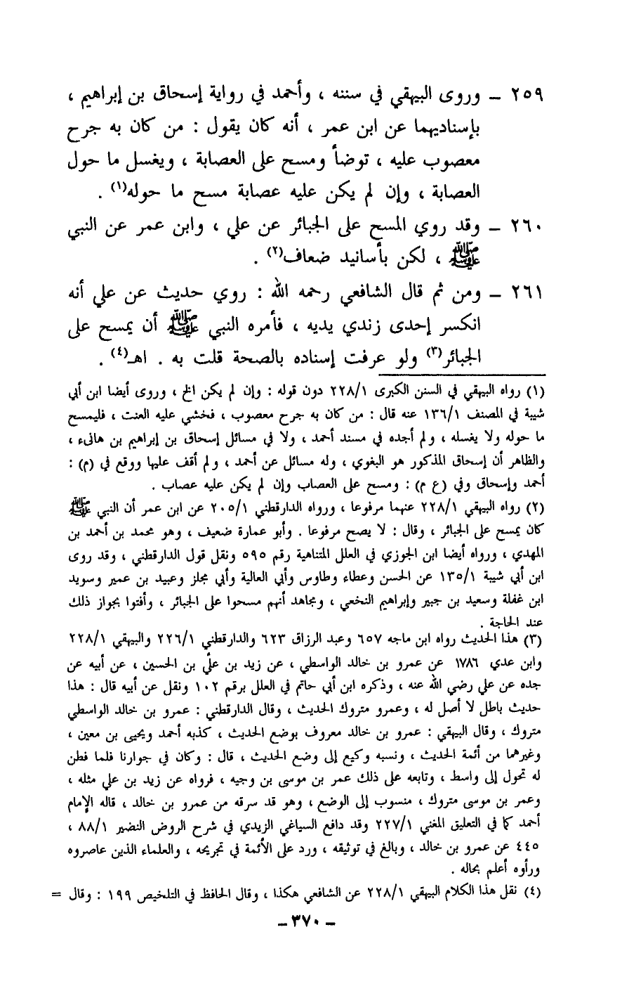 260 - وقد روي المسح على الجبائر عن علي، وابن عمر عن النبي - صَلَّى اللَّهُ عَلَيْهِ وَسَلَّمَ - لكن بأسانيد ضعاف.