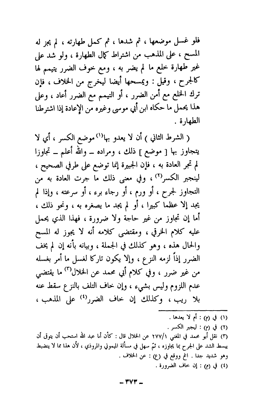 (الشرط الثاني) : أن لا يعدو بها موضع الكسر، أي لا يتجاوز بها [موضع] ذلك، ومراده - والله أعلم - تجاوزا لم تجر العادة به، فإن الجبيرة إنما توضع على طرفي الصحيح، لينجبر الكسر، وفي معنى ذلك ما جرت العادة به من التجاوز لجرح، أو ورم، أو رجاء برء، أو سرعته، وإذا لم يجد إلا عظما كبيرا، أو لم يجد ما يصغره به، ونحو ذلك، أما إن تجاوز من غير حاجة ولا ضرورة، فهذا الذي يحمل عليه كلام الخرقي، ومقتضى كلامه أنه لا يجوز له المسح والحال هذه، وهو كذلك في الجملة، وبيانه بأنه إن لم يخف الضرر إذا لزمه النزع، وإلا يكون تاركا لغسل ما أمر بغسله من غير ضرر، وفي كلام أبي محمد عن الخلال ما يقتضي عدم اللزوم وليس بشيء، وإن خاف التلف بالنزع سقط عنه بلا ريب، وكذلك إن خاف الضرر على المذهب،