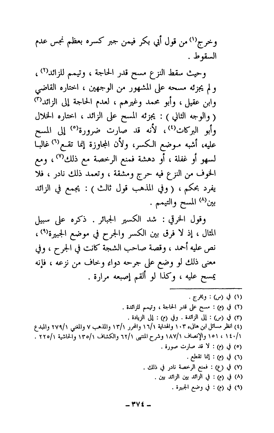 وحيث سقط النزع مسح قدر الحاجة، وتيمم للزائد، ولم يجزئه مسحه على المشهور من الوجهين، اختاره القاضي وابن عقيل، وأبو محمد وغيرهم، لعدم الحاجة إلى الزائد.