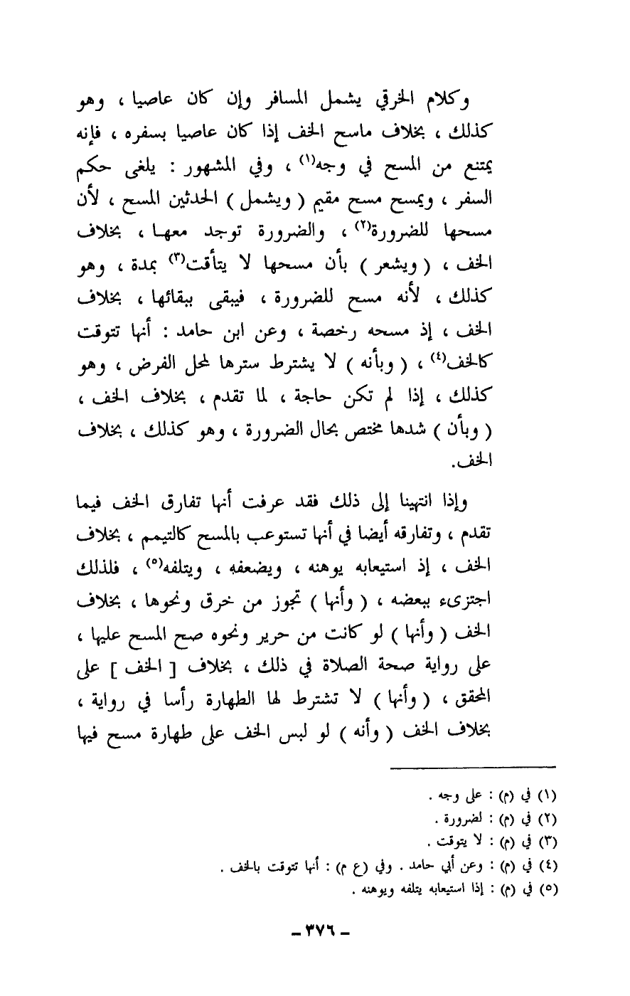 وإذا انتهينا إلى ذلك فقد عرفت أنها تفارق الخف فيما تقدم، وتفارقه أيضا في أنها تستوعب بالمسح كالتيمم، بخلاف الخف، إذ استيعابه يوهنه، ويضعفه، ويتلفه، فلذلك اجتزئ ببعضه، (وأنها) تجوز من خرق ونحوها، بخلاف الخف (وأنها) لو كانت من حرير ونحوه صح المسح عليها، على رواية صحة الصلاة في ذلك، بخلاف [الخف] على المحقق، (وأنها) لا تشترط لها الطهارة رأسا في رواية، بخلاف الخف (وأنه) لو لبس الخف على طهارة مسح فيها
