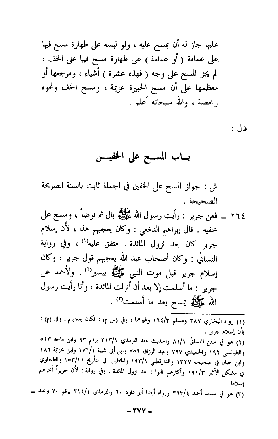 264 - فعن جرير: «رأيت رسول الله - صَلَّى اللَّهُ عَلَيْهِ وَسَلَّمَ - بال ثم توضأ، ومسح على خفيه.» قال إبراهيم النخعي: وكان يعجبهم هذا، لأن إسلام جرير كان بعد نزول المائدة. متفق عليه، وفي رواية النسائي: وكان أصحاب عبد الله يعجبهم قول جرير، وكان إسلام جرير قبل موت النبي - صَلَّى اللَّهُ عَلَيْهِ وَسَلَّمَ - بيسير. ولأحمد «عن جرير: ما أسلمت إلا بعد أن أنزلت المائدة، وأنا رأيت رسول الله - صَلَّى اللَّهُ عَلَيْهِ وَسَلَّمَ - يمسح بعد ما أسلمت» .