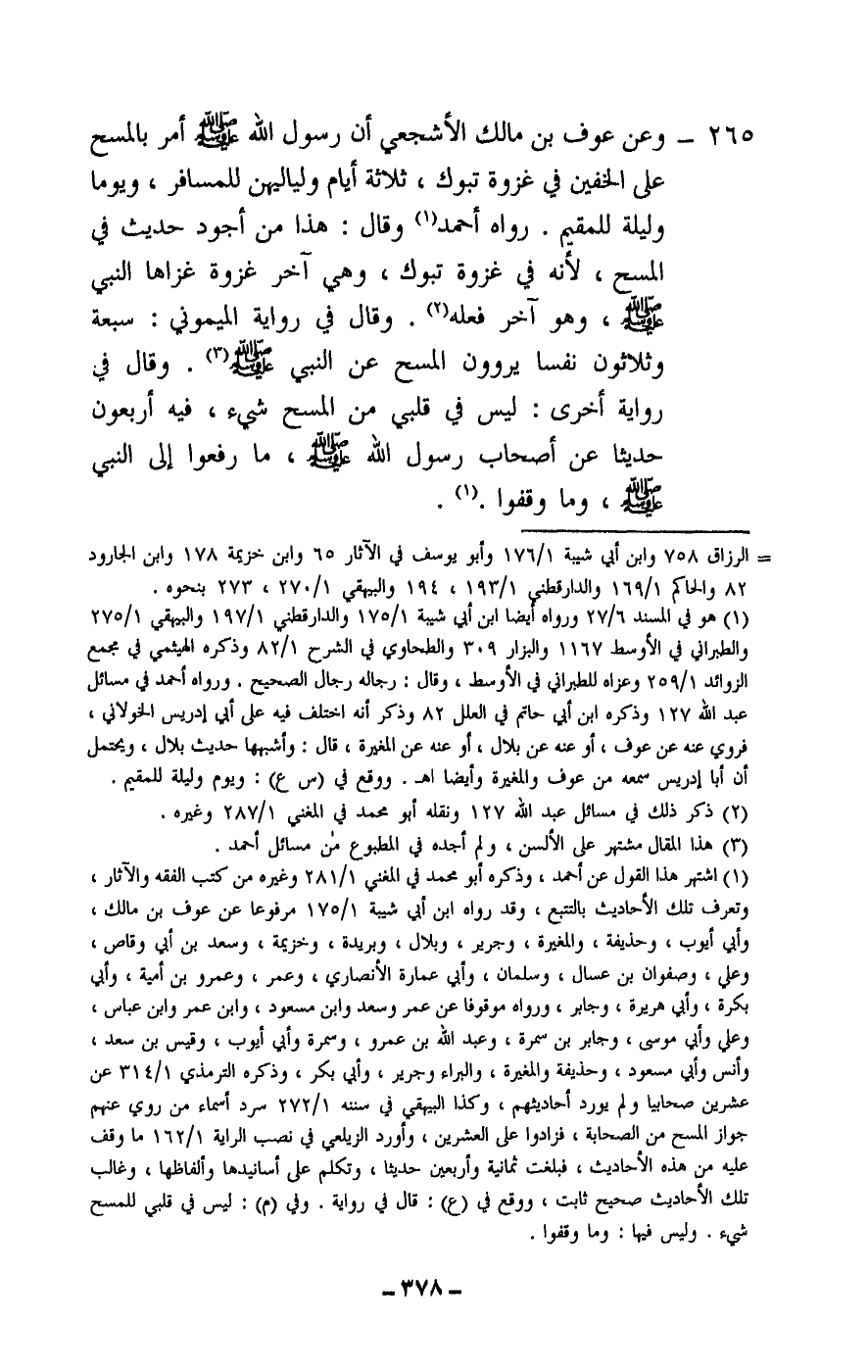 265 - «وعن عوف بن مالك الأشجعي أن رسول الله - صَلَّى اللَّهُ عَلَيْهِ وَسَلَّمَ - أمر بالمسح على الخفين في غزوة تبوك، ثلاثة أيام ولياليهن للمسافر، ويوما وليلة للمقيم» . رواه أحمد وقال: هذا من أجود حديث في المسح، لأنه في غزوة تبوك، وهي آخر غزوة غزاها النبي - صَلَّى اللَّهُ عَلَيْهِ وَسَلَّمَ - وهو آخر فعله. وقال في رواية الميموني: سبعة وثلاثون نفسا يروون المسح عن النبي - صَلَّى اللَّهُ عَلَيْهِ وَسَلَّمَ -. وقال في رواية أخرى: ليس في قلبي من المسح شيء، فيه أربعون حديثا عن أصحاب رسول الله - صَلَّى اللَّهُ عَلَيْهِ وَسَلَّمَ - وما رفعوا إلى النبي - صَلَّى اللَّهُ عَلَيْهِ وَسَلَّمَ - وما وقفوا.