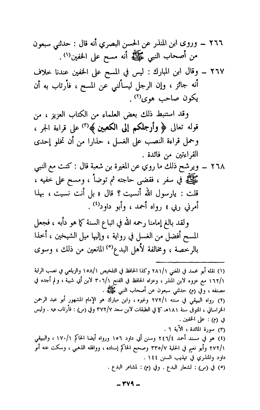266 - وروى ابن المنذر عن الحسن البصري أنه قال: حدثني سبعون من أصحاب النبي - صَلَّى اللَّهُ عَلَيْهِ وَسَلَّمَ - أنه مسح على الخفين.
