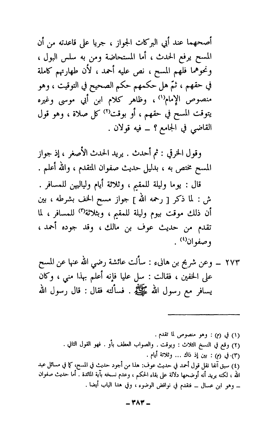 273 - وعن «شريح بن هانئ: سألت عائشة - رَضِيَ اللَّهُ عَنْهَا - عن المسح على الخفين، فقالت: سل عليا فإنه أعلم بهذا مني، وكان يسافر مع رسول الله - صَلَّى اللَّهُ عَلَيْهِ وَسَلَّمَ - فسألته فقال: قال رسول الله