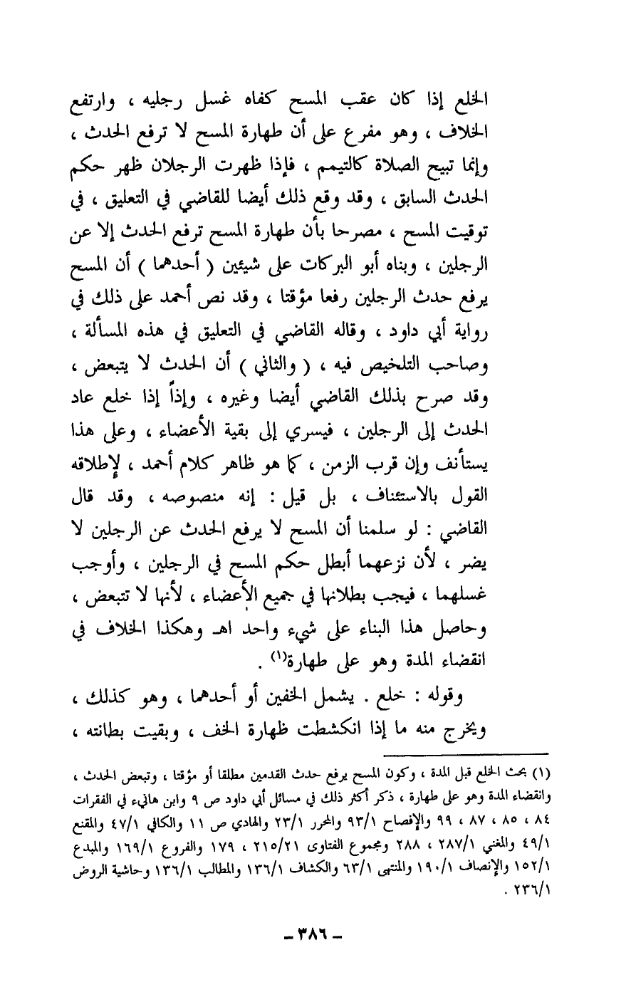 (والثاني) : أن الحدث لا يتبعض، وقد صرح بذلك القاضي أيضا وغيره، وإذا إذا خلع عاد الحدث إلى الرجلين، فيسري إلى بقية الأعضاء، وعلى هذا يستأنف وإن قرب الزمن، كما هو ظاهر كلام أحمد، لإطلاقه القول بالاستئناف، بل قيل: إنه منصوصه، وقد قال القاضي: لو سلمنا أن المسح لا يرفع الحدث عن الرجلين لا يضر، لأن نزعهما أبطل حكم المسح في الرجلين، وأوجب غسلهما، فيجب بطلانها في جميع الأعضاء، لأنها لا تتبعض، وحاصل هذا البناء على شيء واحد اهـ وهكذا الخلاف في انقضاء المدة وهو على طهارة.
