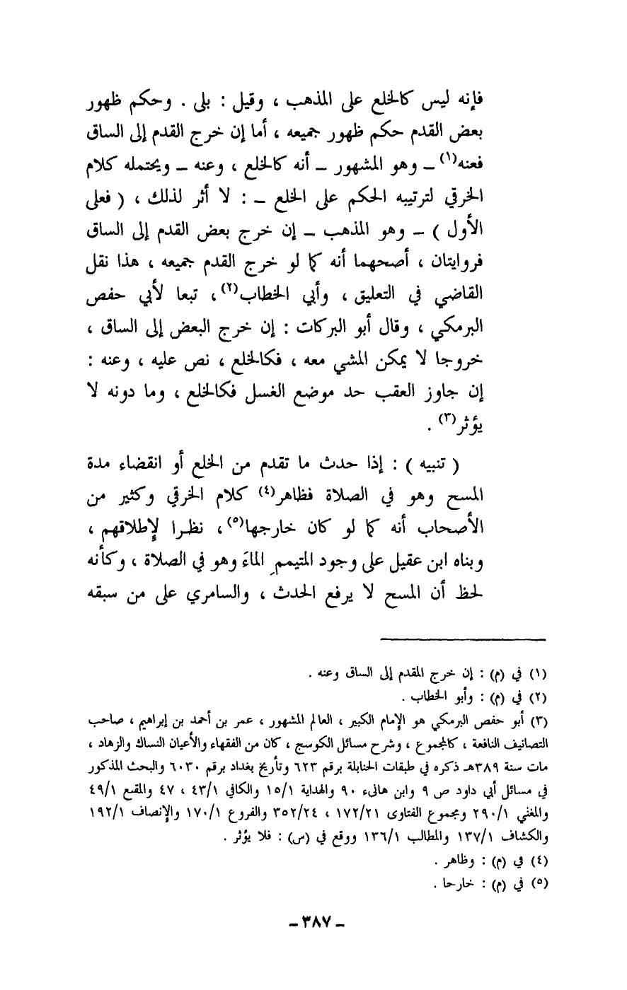 فإنه ليس كالخلع على المذهب، وقيل: بلى. وحكم ظهور بعض القدم حكم ظهور جميعه، أما إن خرج القدم إلى الساق فعنه - وهو المشهور - أنه كالخلع، وعنه - ويحتمله كلام الخرقي لترتيبه الحكم على الخلع -: لا أثر لذلك، (فعلى الأول) - وهو المذهب - إن خرج بعض القدم إلى الساق فروايتان، أصحهما أنه كما لو خرج القدم جميعه، هذا نقل القاضي في التعليق، وأبي الخطاب، تبعا لأبي حفص البرمكي، وقال أبو البركات: إن خرج البعض إلى الساق، خروجا لا يمكن المشي معه، فكالخلع، نص عليه، وعنه: إن جاوز العقب حد موضع الغسل فكالخلع، وما دونه لا يؤثر.