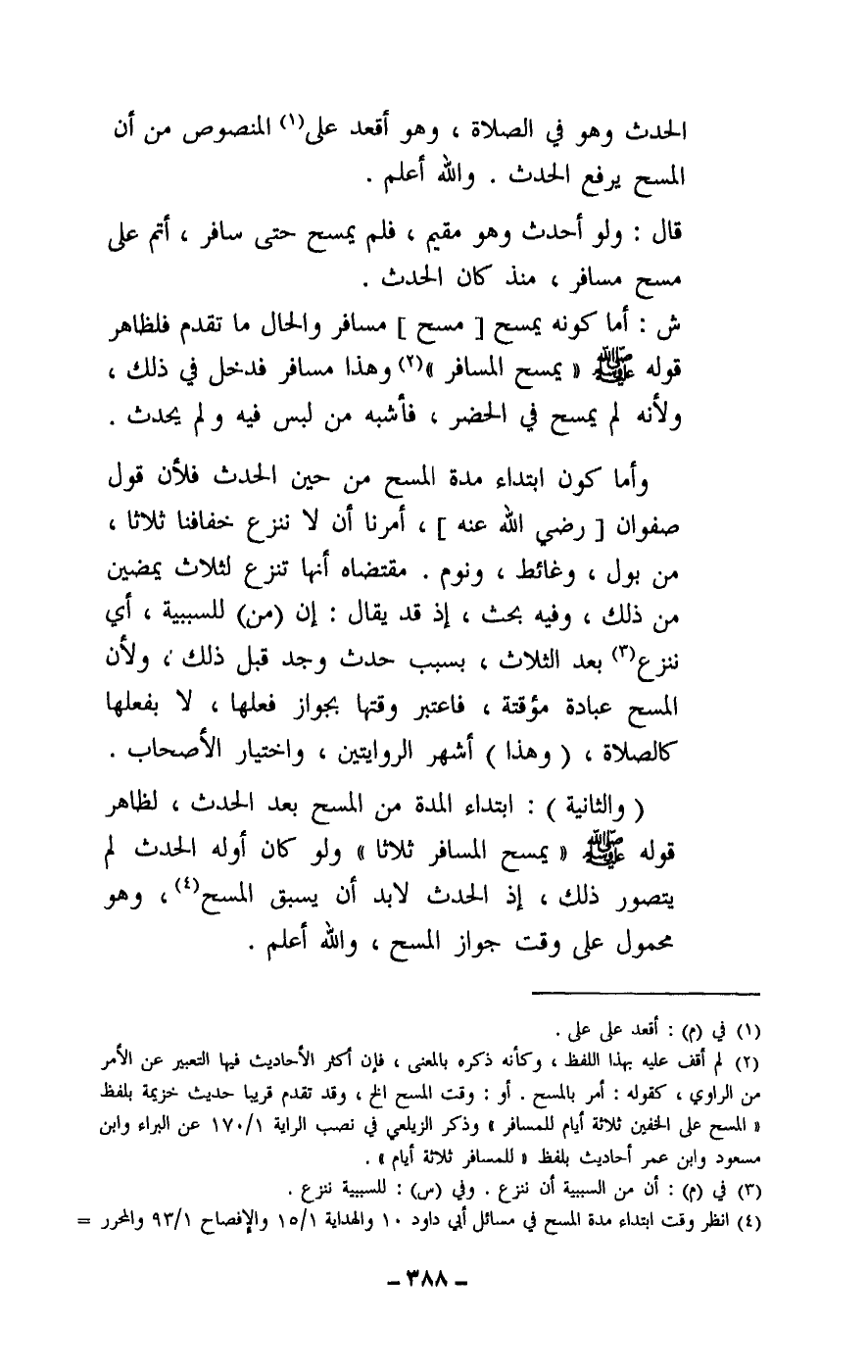 (والثانية) : ابتداء المدة من المسح بعد الحدث، لظاهر قوله - صَلَّى اللَّهُ عَلَيْهِ وَسَلَّمَ -: «يمسح المسافر ثلاثا» ولو كان أوله الحدث لم يتصور ذلك، إذا الحدث لا بد أن يسبق المسح، وهو محمول على وقت جواز المسح، والله أعلم.