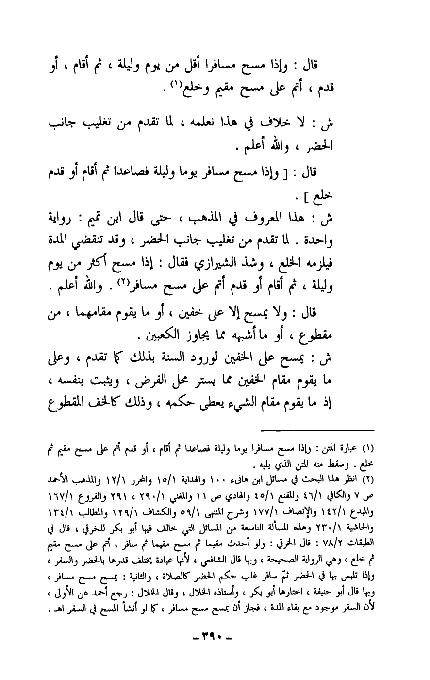 ش: هذا المعروف في المذهب، حتى قال ابن تميم: رواية واحدة. لما تقدم من تغليب جانب الحضر، وقد تنقضي المدة فيلزمه الخلع، وشذ الشيرازي فقال: إذا مسح أكثر من يوم وليلة، ثم أقام أو قدم أتم على مسح مسافر. والله أعلم.