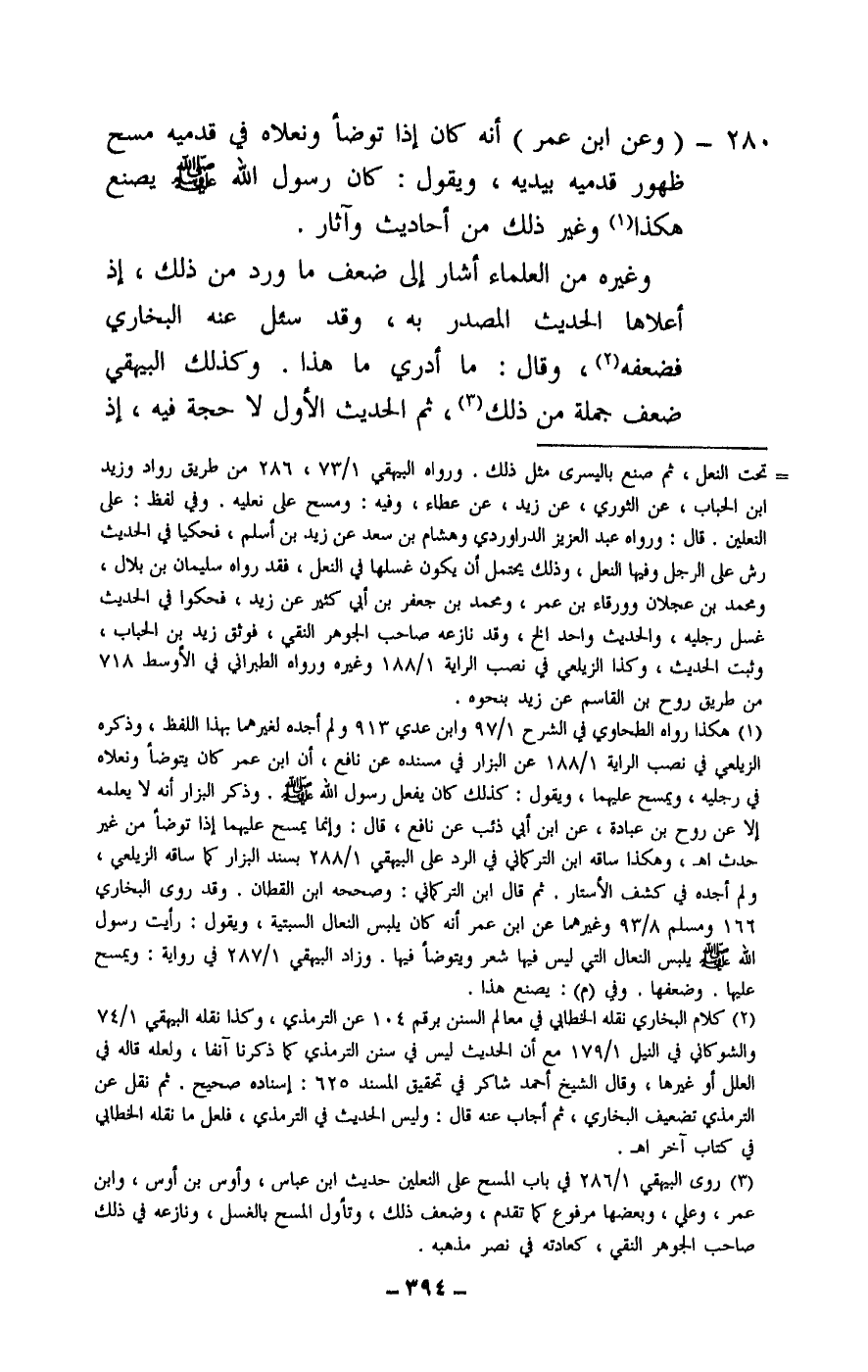280 - «وعن ابن عمر أنه كان إذا توضأ ونعلاه في قدميه مسح ظهور قدميه بيديه، ويقول: كان رسول الله - صَلَّى اللَّهُ عَلَيْهِ وَسَلَّمَ - يصنع هكذا» وغير ذلك من أحاديث وآثار.