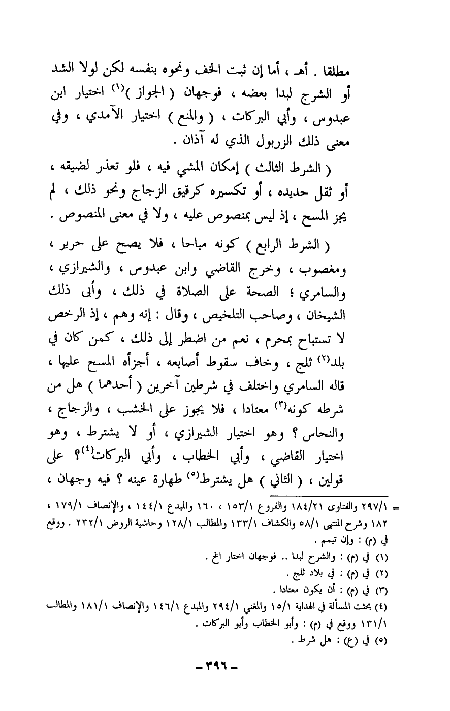(الشرط الرابع) : كونه مباحا، فلا يصح على حرير، ومغصوب، وخرج القاضي، وابن عبدوس، والشيرازي، والسامري الصحة على الصلاة في ذلك، وأبى ذلك الشيخان، وصاحب التلخيص، وقال: إنه وهم، إذ الرخص لا تستباح بمحرم، نعم من اضطر إلى ذلك، كمن كان في بلد ثلج، وخاف سقوط أصابعه، أجزأه المسح عليها، قاله السامري واختلف في شرطين آخرين (أحدهما) : هل من شرطه كونه معتادا فلا يجوز على الخشب، والزجاج، والنحاس؟ وهو اختيار الشيرازي، أو لا يشترط، وهو اختيار القاضي، وأبي الخطاب، وأبي البركات؟ على قولين، (الثاني) : هل يشترط طهارة عينه؟ فيه وجهان،