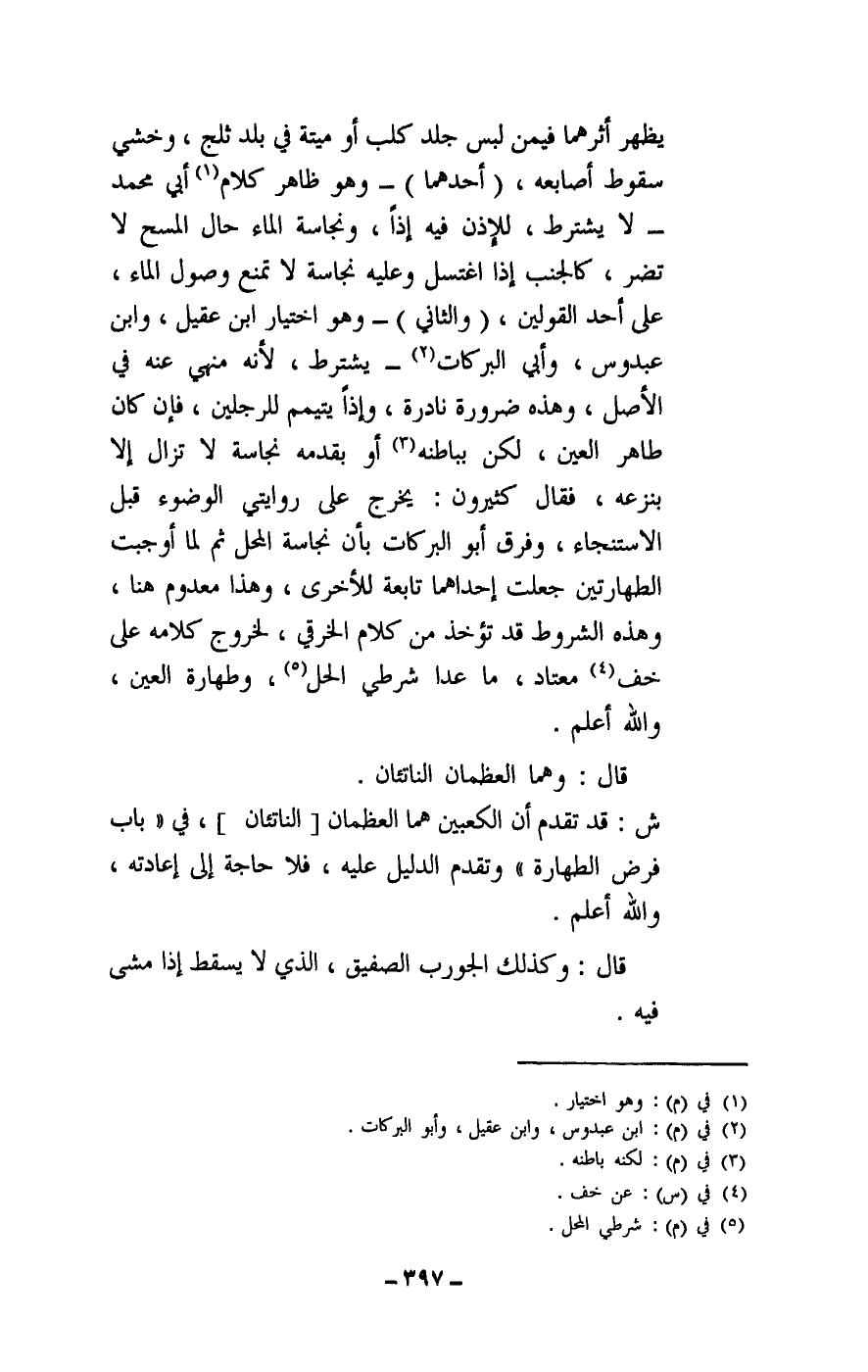 يظهر أثرهما فيمن لبس جلد كلب أو ميتة في بلد ثلج، وخشي سقوط أصابعه، (أحدهما) - وهو ظاهر كلام أبي محمد - لا يشترط، للإذن فيه إذا، ونجاسة الماء حال المسح لا تضر، كالجنب إذا اغتسل وعليه نجاسة لا تمنع وصول الماء، على أحد القولين، (والثاني) - وهو اختيار ابن عقيل، وابن عبدوس، وأبي البركات - يشترط، لأنه منهي عنه في الأصل، وهذه ضرورة نادرة، وإذا يتيمم للرجلين، فإن كان طاهر العين، لكن بباطنه أو بقدمه نجاسة لا تزال إلا بنزعه، فقال كثيرون: يخرج على روايتي الوضوء قبل الاستنجاء، وفرق أبو البركات بأن نجاسة المحل ثم لما أوجبت الطهارتين جعلت إحداهما تابعة للأخرى، وهذا معدوم هنا، وهذه الشروط قد تؤخذ من كلام الخرقي، لخروج كلامه على خف معتاد، ماعدا شرطي الحل، وطهارة العين، والله أعلم.