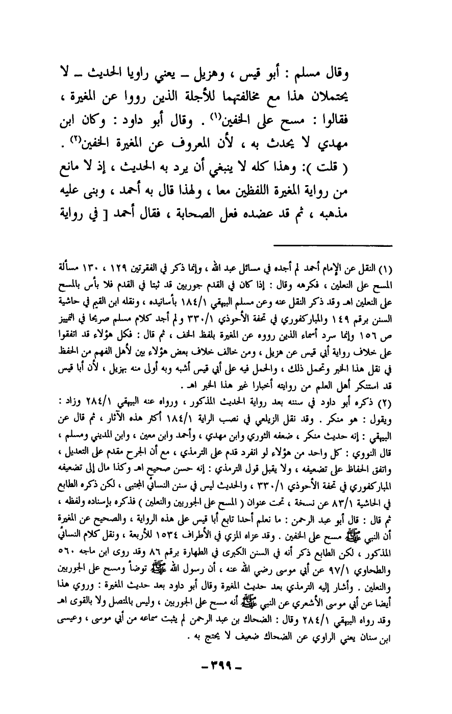 وقال مسلم: أبوقيس، وهزيل - يعني راويا الحديث - لا يحتملان هذا مع مخالفتهما للأجلة الذين رووا عن المغيرة، فقالوا: مسح على الخفين. وقال أبو داود: وكان ابن مهدي لا يحدث به، لأن المعروف عن المغيرة الخفين.