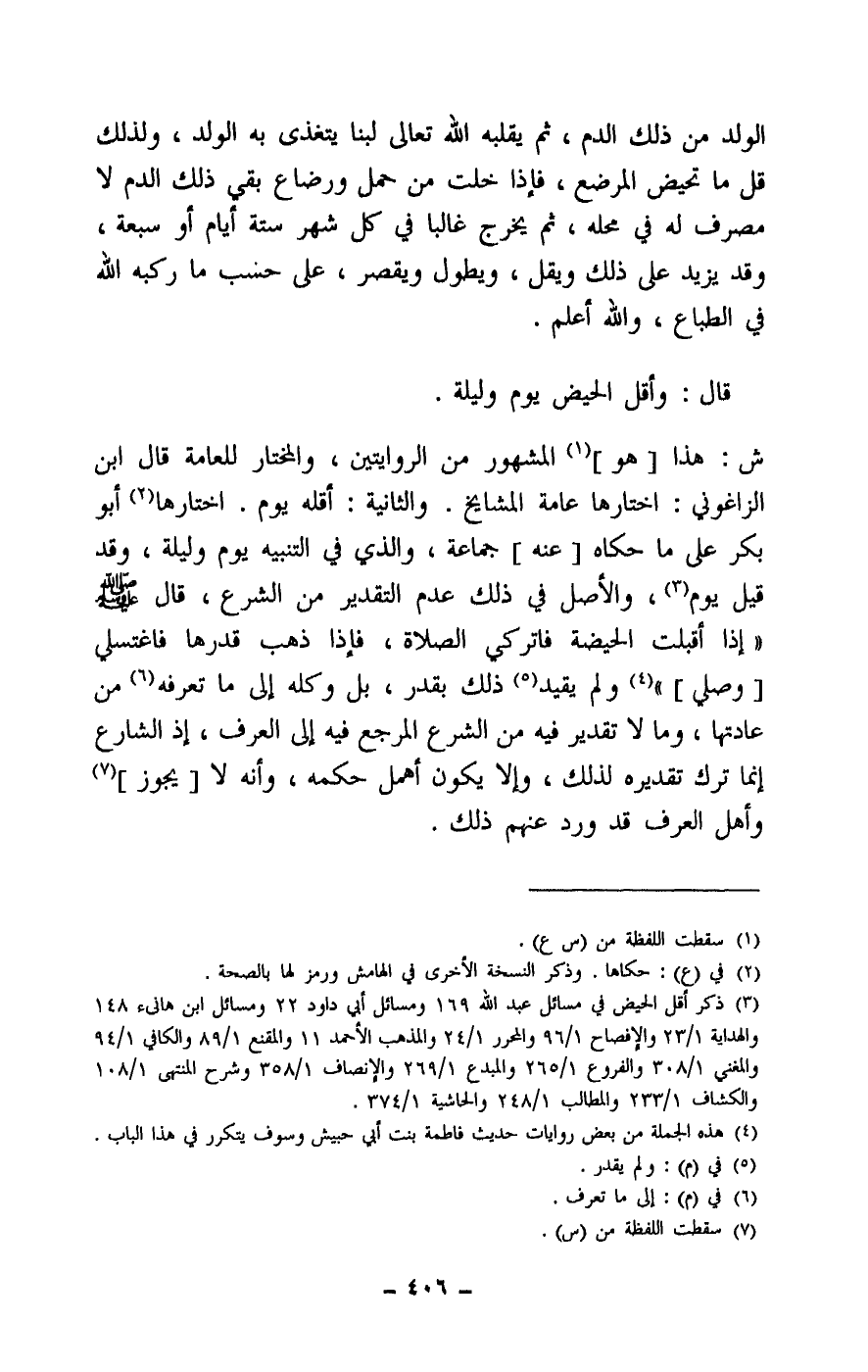 قال: وأقل الحيض يوم وليلة ش: هذا [هو] المشهور من الروايتين، والمختار للعامة. قال ابن الزاغوني: اختارها عامة المشايخ. والثانية: أقله يوم. اختارها أبو بكر على ما حكاه [عنه] جماعة، والذي في التنبيه يوم وليلة، وقد قيل يوم، والأصل في ذلك عدم التقدير من الشرع، قال - صَلَّى اللَّهُ عَلَيْهِ وَسَلَّمَ -: «إذا أقبلت الحيضة فاتركي الصلاة، فإذا ذهب قدرها فاغتسلي [وصلي] » ولم يقيد ذلك بقدر، بل وكله إلى ما تعرفه من عادتها، وما لا تقدير فيه من الشرع المرجع فيه إلى العرف، إذ الشارع إنما ترك تقديره لذلك، وإلا يكون أهمل حكمه، وأنه لا [يجوز] وأهل العرف قد ورد عنهم ذلك.