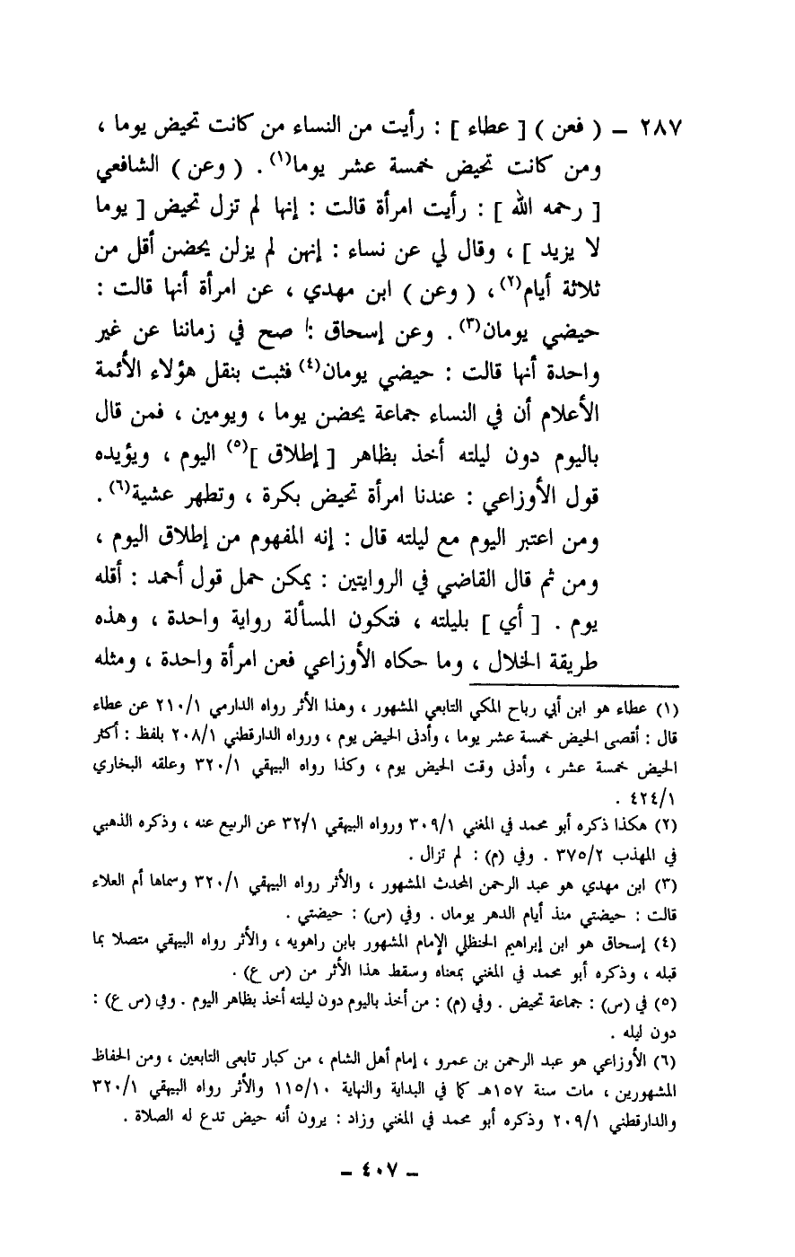 287 - (فعن) [عطاء] : رأيت من النساء من كانت تحيض يوما، ومن كانت تحيض خمسة عشر يوما. (وعن: الشافعي [- رَحِمَهُ اللَّهُ -] : رأيت امرأة قالت: إنها لم تزل تحيض [يوما لا يزيد] ، وقال لي عن نساء: إنهن لم يزلن يحضن أقل من ثلاثة أيام، (وعن) ابن مهدي، عن امرأة أنها قالت: حيضي يومان. وعن إسحاق: صح في زماننا عن غير واحدة أنها قالت: حيضي يومان فثبت بنقل هؤلاء الأئمة الأعلام أن في النساء جماعة يحضن يوما، ويومين، فمن قال باليوم دون ليلته أخذ بظاهر [إطلاق] اليوم، ويؤيده قول الأوزاعي: عندنا امرأة تحيض بكرة، وتطهر عشية. ومن اعتبر اليوم مع ليلته قال: إنه المفهوم من إطلاق اليوم، ومن ثم قال القاضي في الروايتين: يمكن حمل قول أحمد: أقله يوم. [أي] : بليلته، فتكون المسألة رواية واحدة، وهذه طريقة الخلال، وما حكاه الأوزاعي فعن امرأة واحدة، ومثله
