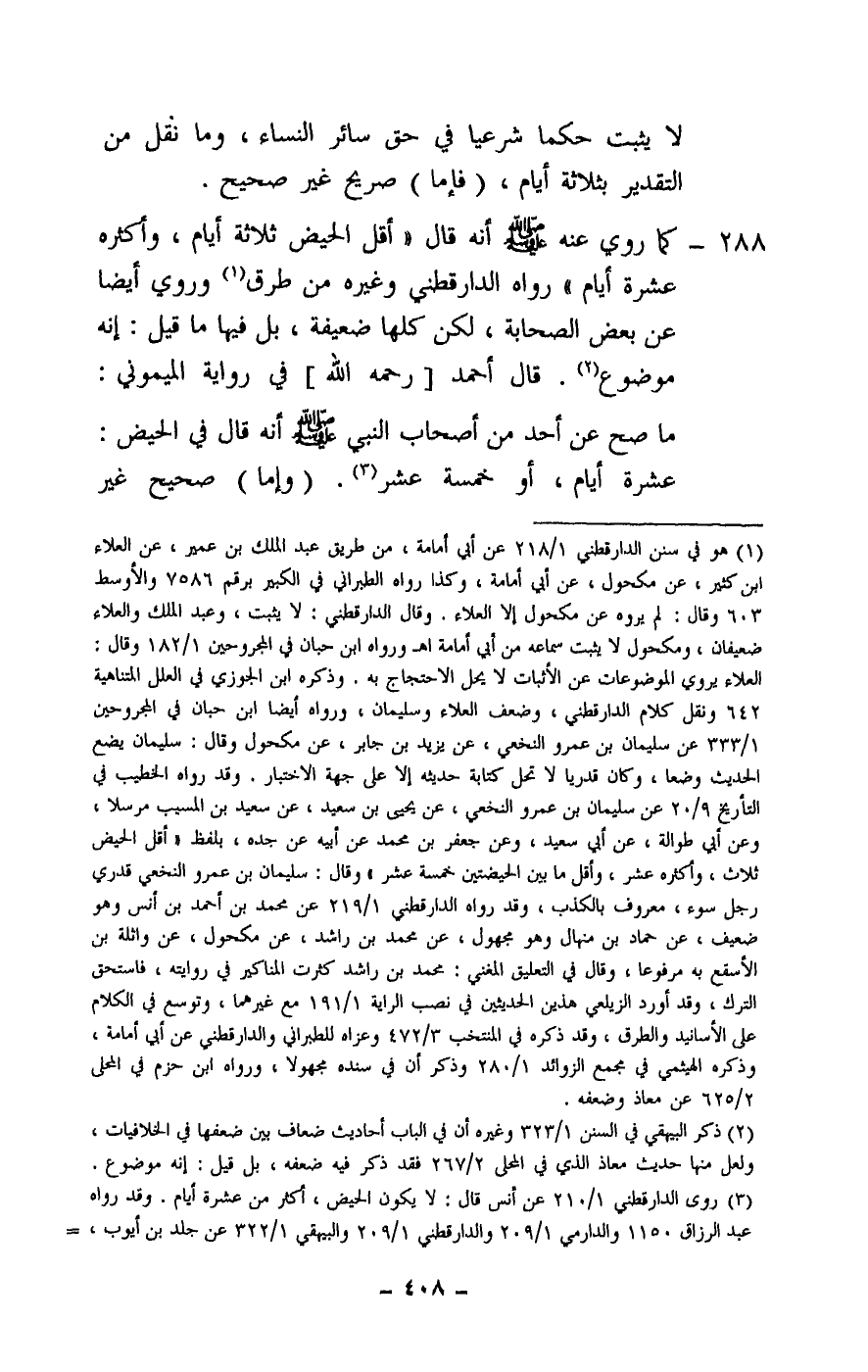 288 - كما روى عنه - صَلَّى اللَّهُ عَلَيْهِ وَسَلَّمَ - أنه قال: «أقل الحيض ثلاثة أيام، وأكثره عشرة أيام» رواه الدارقطني وغيره من طرق وروي - أيضا - عن بعض الصحابة، لكن كلها ضعيفة، بل فيها ما قيل: إنه موضوع. قال أحمد [- رَحِمَهُ اللَّهُ -] في رواية الميموني:) ما صح عن أحد من أصحاب النبي - صَلَّى اللَّهُ عَلَيْهِ وَسَلَّمَ - أنه قال في الحيض: عشرة أيام، أو خمسة عشرة. (وإما) صحيح