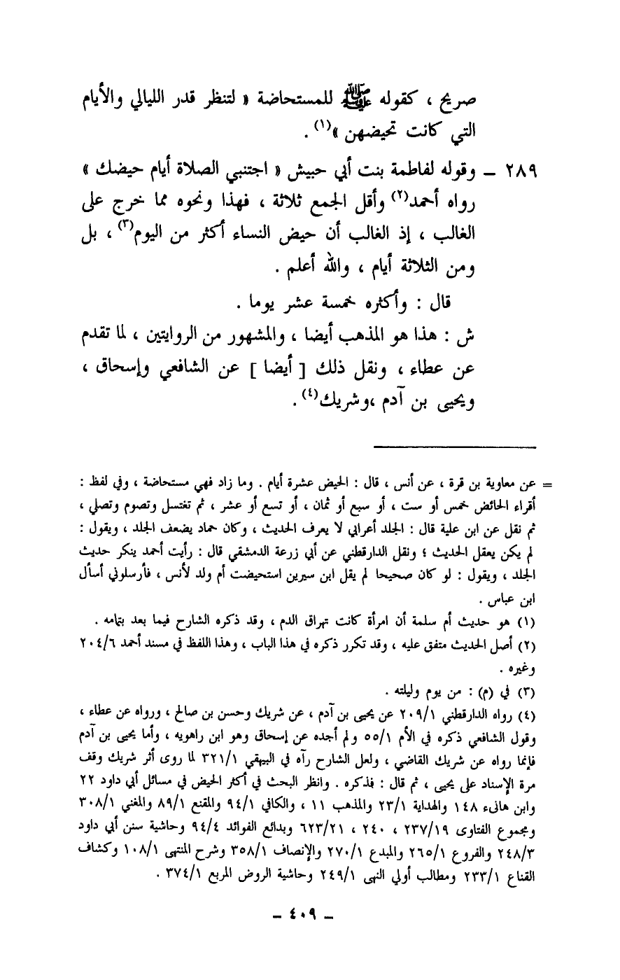 289 - وقوله لفاطمة بنت أبي حبيش: «اجتنبي الصلاة أيام حيضك» رواه أحمد وأقل الجمع ثلاثة، فهذا ونحوه مما خرج على الغالب، إذ الغالب أن حيض النساء أكثر من اليوم، بل ومن الثلاثة أيام، والله أعلم.