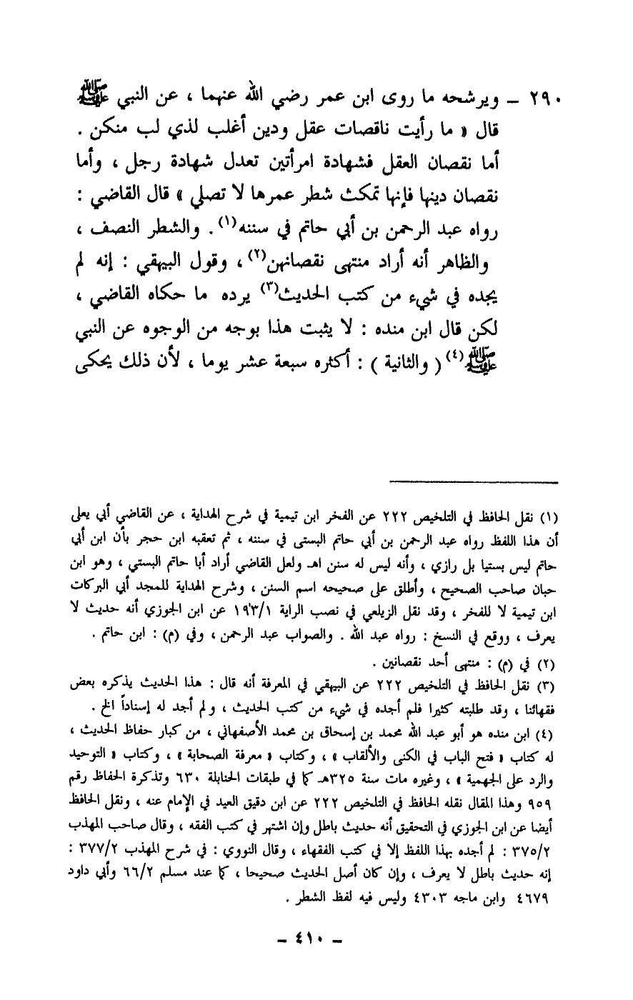 290 - ويرشحه ما روى ابن عمر - رَضِيَ اللَّهُ عَنْهُمَا - عن النبي - صَلَّى اللَّهُ عَلَيْهِ وَسَلَّمَ - قال: «ما رأيت ناقصات عقل ودين أغلب لذي لب منكن أما نقصان العقل فشهادة امرأتين تعدل شهادة رجل، وأما نقصان دينها فإنها تمكث شطر عمرها لا تصلي» قال القاضي: رواه عبد الرحمن بن أبي حاتم في سننه. والشطر النصف، والظاهر أنه أراد منتهى نقصانهن، وقول البيهقي: إنه لم يجده في شيء من كتب الحديث يرده ما حكاه القاضي، لكن قال ابن منده: لا يثبت هذا بوجه من الوجوه عن النبي - صَلَّى اللَّهُ عَلَيْهِ وَسَلَّمَ - (والثانية) : أكثره سبعة عشر يوما، لأن ذلك يحكى