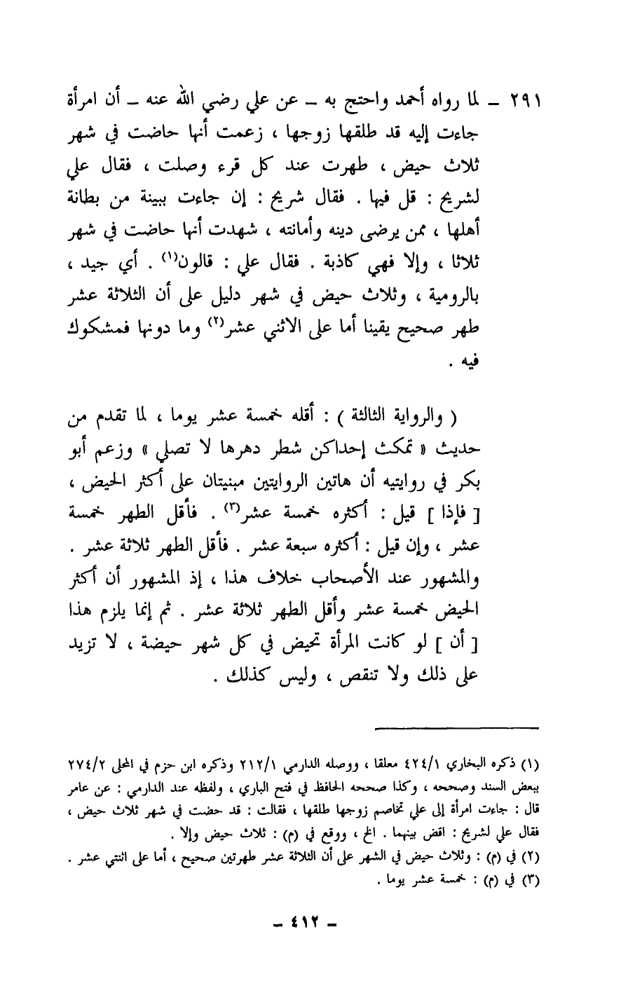 291 - لما رواه أحمد واحتج به - عن علي - رَضِيَ اللَّهُ عَنْهُ - أن امرأة جاءت إليه قد طلقها زوجها، زعمت أنها حاضت في شهر ثلاث حيض، طهرت عند كل قرء وصلت، فقال علي لشريح: قل فيها. فقال شريح: إن جاءت ببينة من بطانة أهلها، ممن يرضى دينه وأمانته، شهدت أنها حاضت في شهر ثلاثا، وإلا فهي كاذبة. فقال علي: قالون. أي جيد، بالرومية، وثلاث حيض في شهر دليل على أن الثلاثة عشر طهر صحيح يقينا أما على الاثني عشر وما دونها فمشكوك فيه.