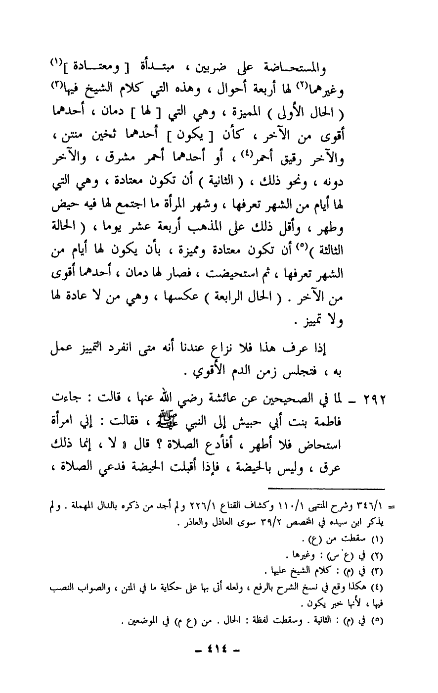292 - لما في الصحيحين عن عائشة - رَضِيَ اللَّهُ عَنْهَا - قالت: «جاءت فاطمة بنت أبي حبيش إلى النبي - صَلَّى اللَّهُ عَلَيْهِ وَسَلَّمَ - فقالت: إني امرأة استحاض فلا أطهر، أفأدع الصلاة؟ قال: «لا، إنما ذلك عرق، وليس بالحيضة، فإذا أقبلت الحيضة فدعي الصلاة