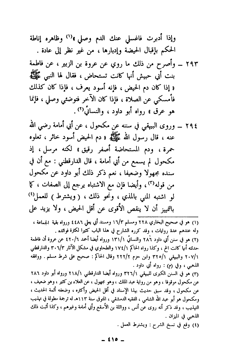 293 - وأصرح من ذلك ما روي عن عروة بن الزبير، «عن فاطمة بنت أبي حبيش أنها كانت تستحاض، فقال لها النبي - صَلَّى اللَّهُ عَلَيْهِ وَسَلَّمَ -: «إذا كان دم الحيض، فإنه أسود يعرف، فإذا كان كذلك فأمسكي عن الصلاة، فإذا كان الآخر فتوضئي وصلي، فإنما هو عرق» رواه أبو داود، والنسائي.