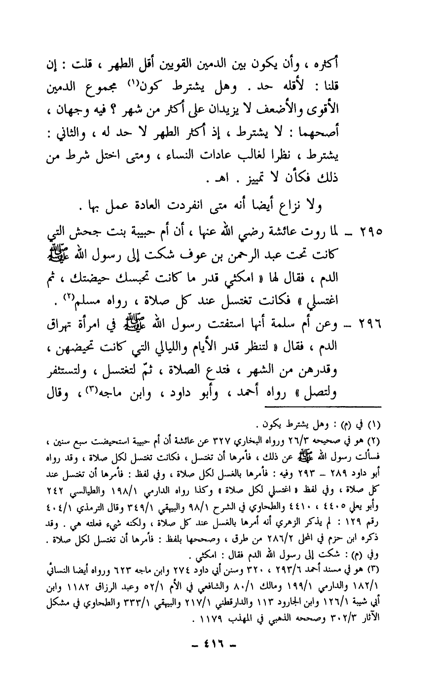 295 - لما روت عائشة - رَضِيَ اللَّهُ عَنْهَا -، «أن أم حبيبة بنت جحش التي كانت تحت عبد الرحمن بن عوف شكت إلى رسول الله - صَلَّى اللَّهُ عَلَيْهِ وَسَلَّمَ - الدم، فقال لها: «امكثي قدر ما كانت تحبسك حيضتك، ثم اغتسلي» فكانت تغتسل عند كل صلاة» ، رواه مسلم.
