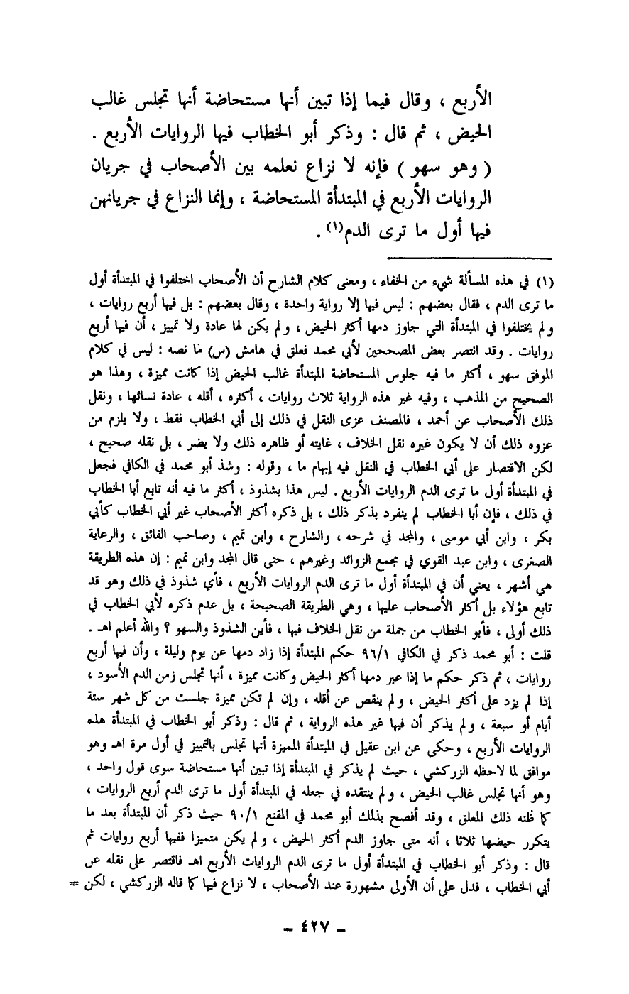 الأربع، وقال فيما إذا تبين أنها مستحاضة أنها تجلس غالب الحيض، ثم قال: وذكر أبو الخطاب فيها الروايات الأربع. (وهو سهو) فإنه لا نزاع نعلمه بين الأصحاب في جريان الروايات الأربع في المبتدأة المستحاضة، وإنما النزاع في جريانهن فيها أول ما ترى الدم.