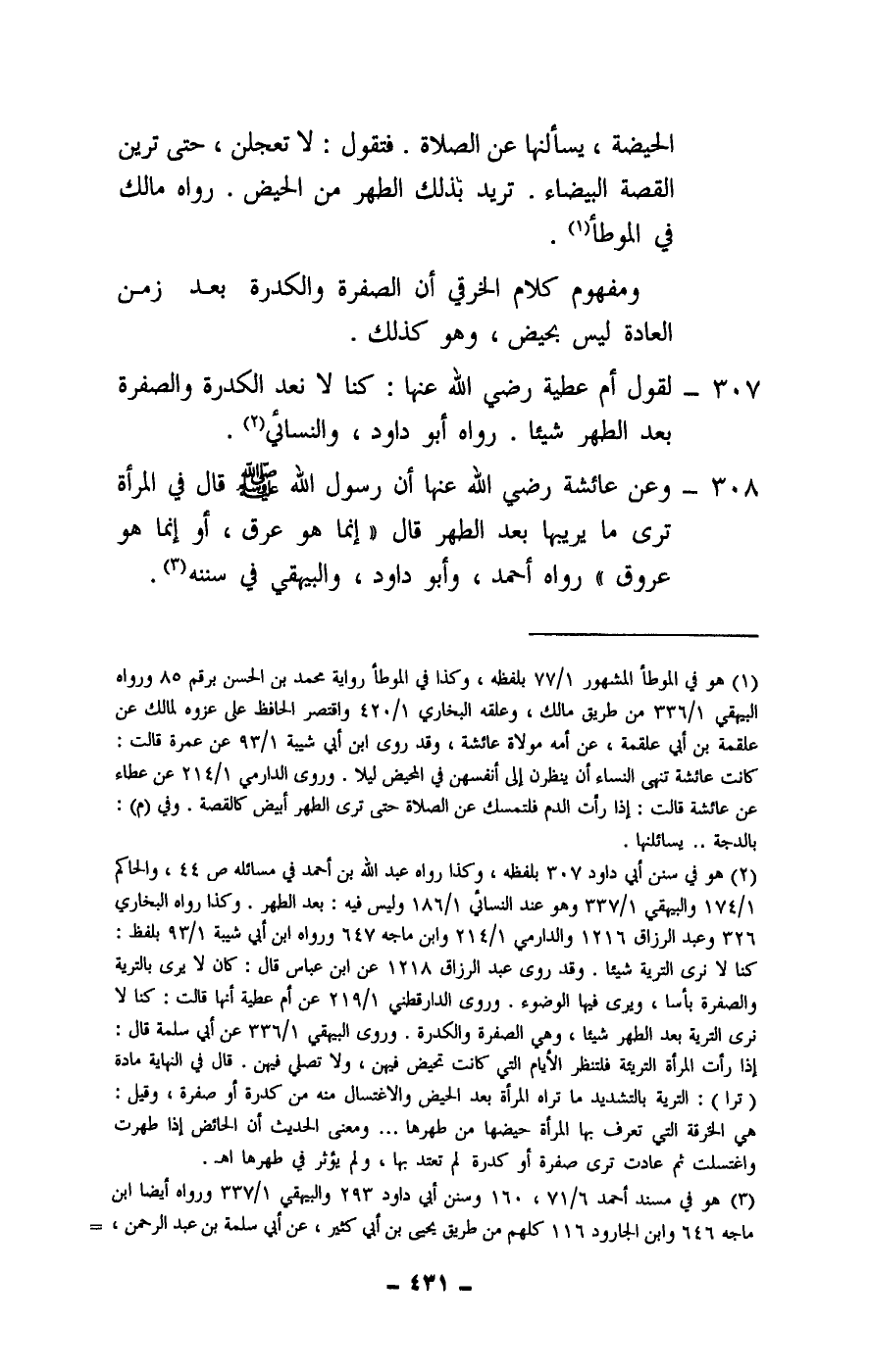 307 - لقول أم عطية - رَضِيَ اللَّهُ عَنْهَا -: كنا لا نعد الكدرة والصفرة بعد الطهر شيئا. رواه أبو داود، والنسائي.