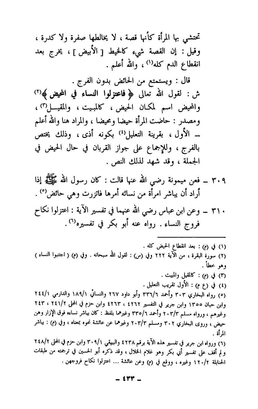 ش: لقول الله تعالى: {فَاعْتَزِلُوا النِّسَاءَ فِي الْمَحِيضِ} [البقرة: 222] والمحيض اسم لمكان الحيض، كالمبيت، والمقيل، ومصدر: حاضت المرأة حيضا ومحيضا، والمراد هنا والله أعلم - الأول، بقرينة التعليل بكونه أذى، وذلك يختص بالفرج، وللإجماع على جواز القربان في حال الحيض في الجملة، وقد شهد لذلك النص.