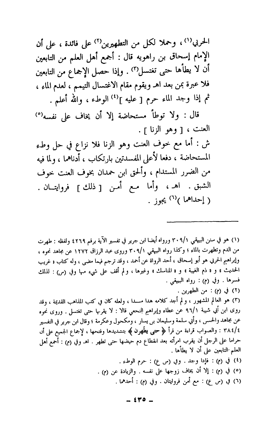 الحربي، وحملا لكل من التطهيرين على فائدة، على أن الإمام إسحاق بن راهويه قال: أجمع أهل العلم من التابعين أن لا يطأها حتى تغتسل. وإذا حصل الإجماع من التابعين فلا عبرة بمن بعد اهـ.