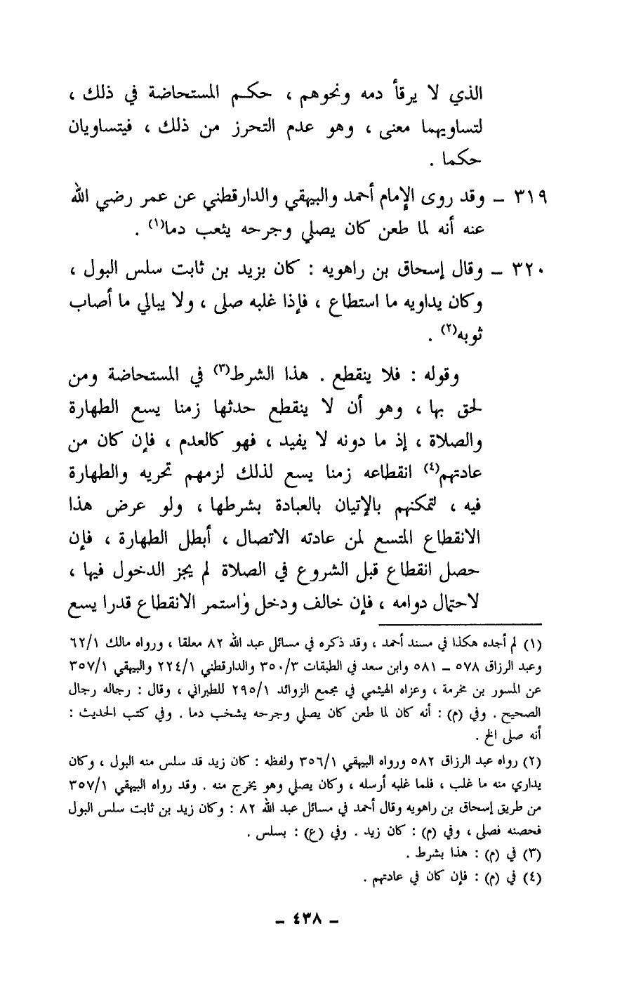 319 - وقد روى الإمام أحمد، والبيهقي، والدارقطني عن عمر - رَضِيَ اللَّهُ عَنْهُ - أنه لما طعن كان يصلي وجرحه يثعب دما.