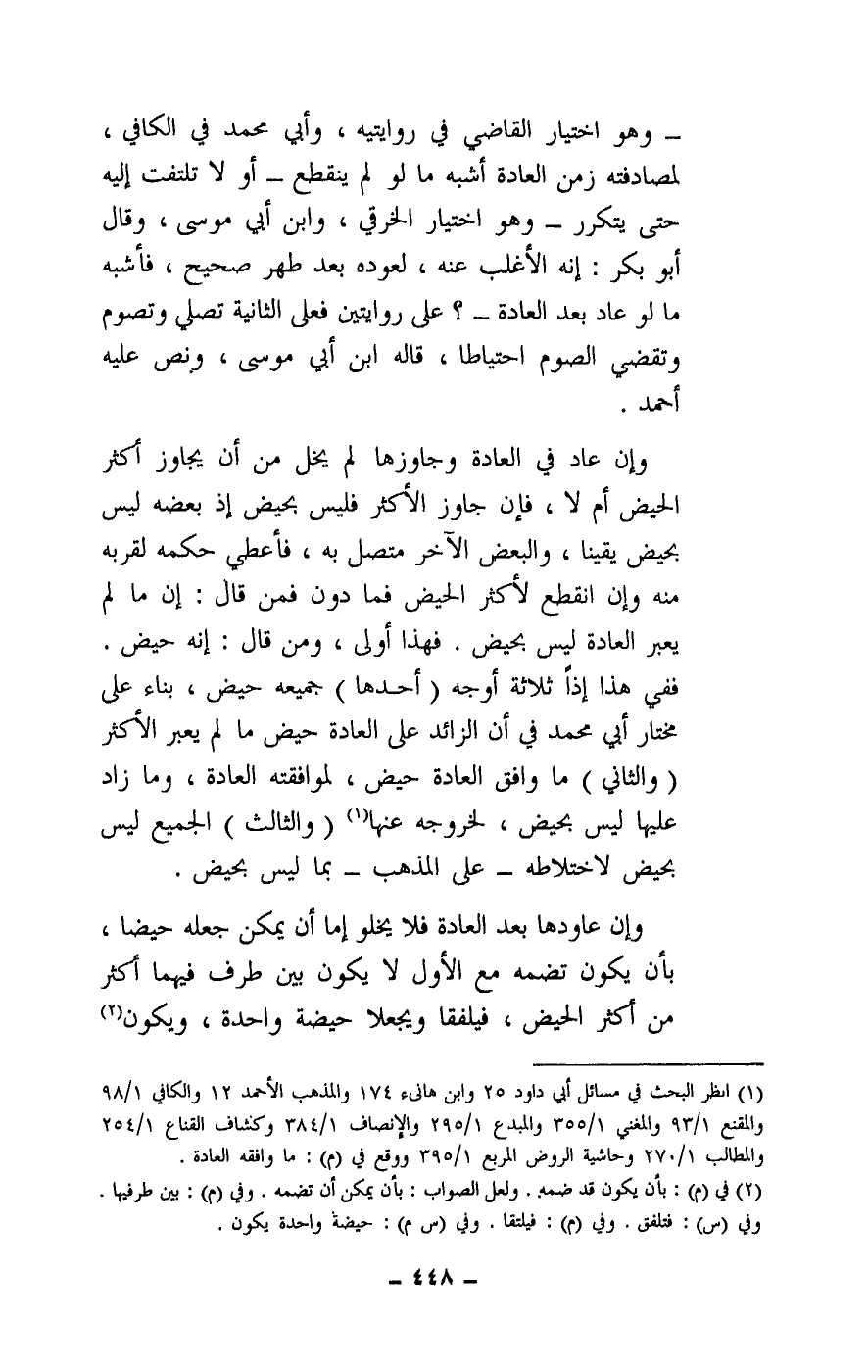 - وهو اختيار القاضي في روايته، وأبى محمد في الكافي، لمصادفته زمن العادة أشبه ما لو لم ينقطع - أو لا تلتفت إلهي حتى يتكرر - وهو اختيار الخرقي، وابن أبي موسى، وقال أبو بكر: إنه الأغلب عنه، لعوده بعد طهر صحيح، فأشبه ما لو عاد بعد العادة -؟ على روايتين فعلى الثانية تصلي وتصوم وتقضي الصوم احتياطا، قاله ابن أبي موسى، ونص عليه أحمد.