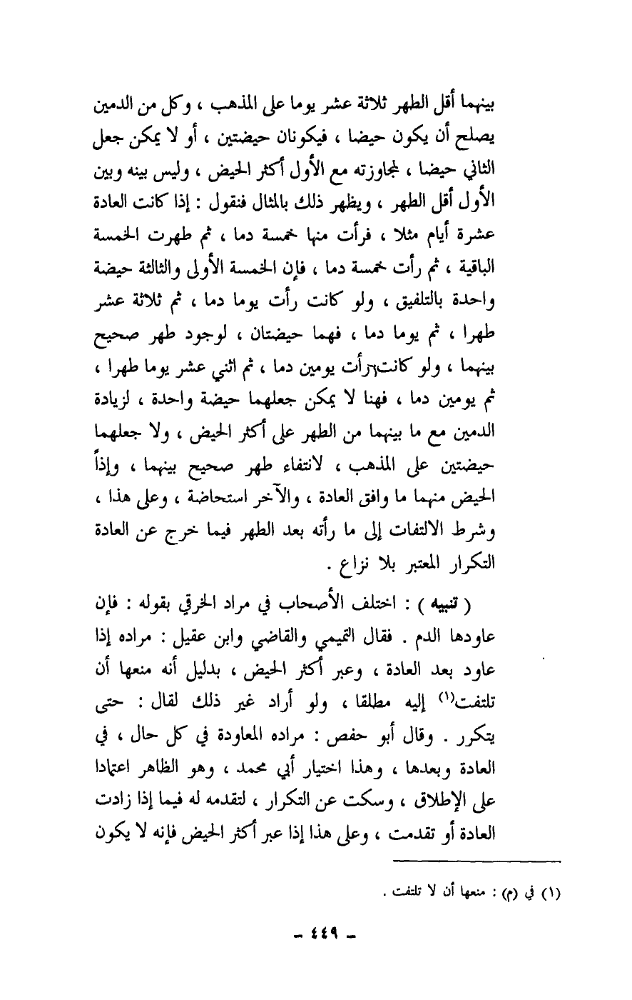 (تنبيه) : اختلف الأصحاب في مراد الخرقي بقوله: فإن عاودها الدم. فقال التميمي، والقاضي، وابن عقيل: مراده إذا عاود بعد العادة، وعبر أكثر الحيض، بدليل أنه منعها أن تلتفت إليه مطلقا، ولو أراد غير ذلك لقال: حتى يتكرر. وقال أبو حفص: مراده المعاودة في كل حال، في العادة وبعدها، وهذا اختيار أبي محمد، وهو الظاهر اعتمادا على الإطلاق، وسكت عن التكرار، لتقدمه له فيما إذا زادت العادة أو تقدمت، وعلى هذا إذا عبر أكثر الحيض فإنه لا يكون